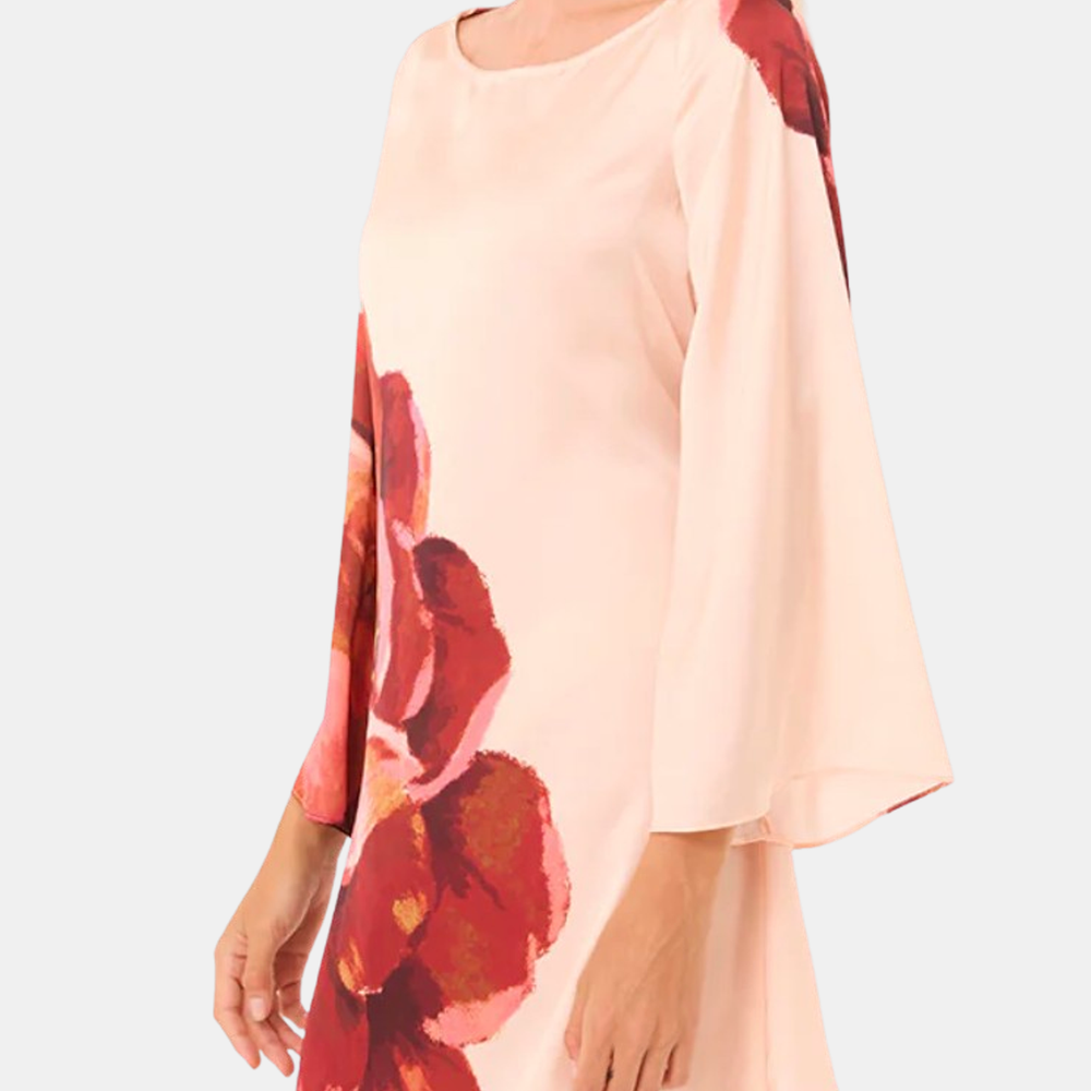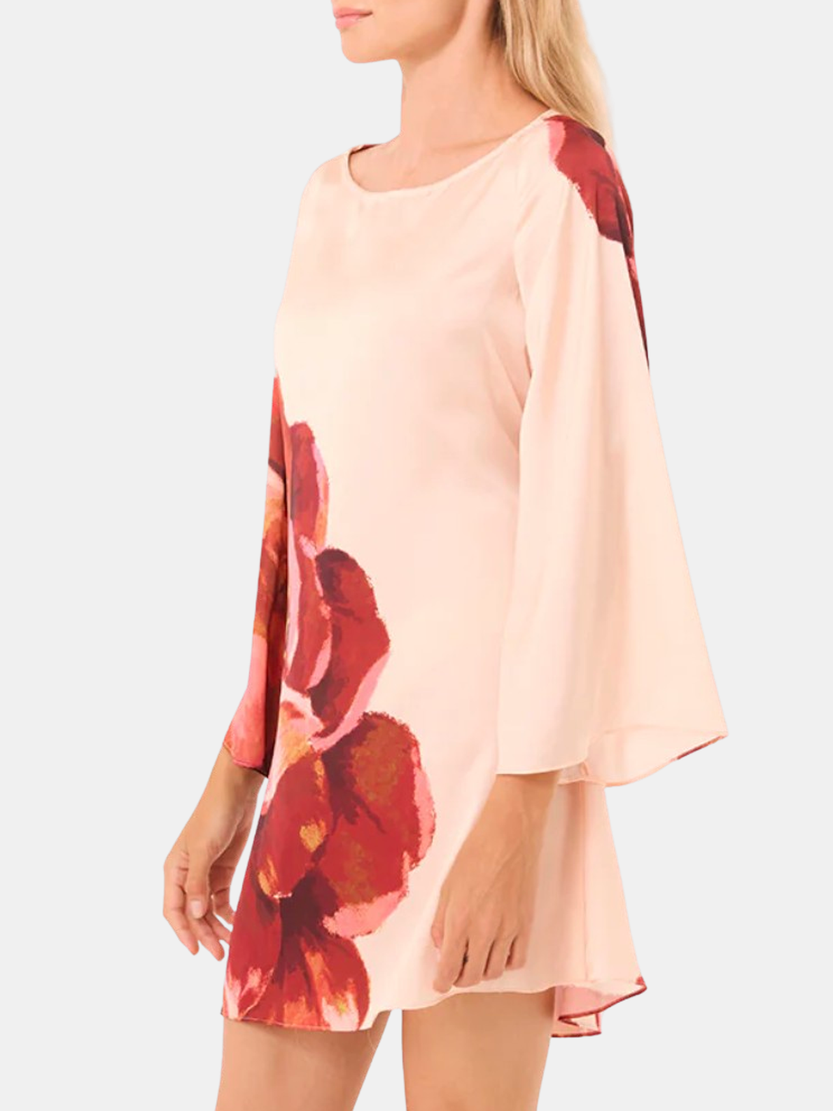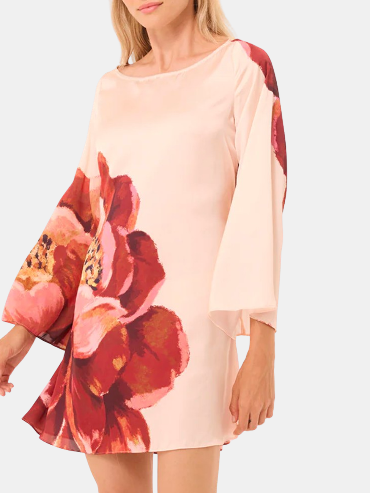 A chic update on a classic shift style, the Twiggy dress is a timeless mini silhouette cut from pale pink satin with a large-scale peony print. A boat neckline flows into long bell sleeves and an adjustable tie waist for a flattering fit. Remove the belt and pair with flats for an effortless daytime look or style with heels for the perfect dinner-ready moment. Shown in Peony Love.