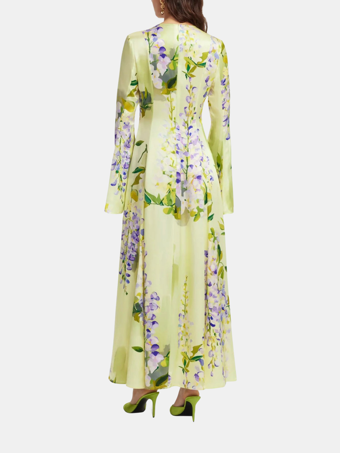 A cascading lilac dream! These beautiful lilac wisteria blooms tumble down a soft lime canvas. This print evokes pure fresh air, and feels like floating through a tranquil, sun-drenched garden on the first day of spring. Shown in Wisteria.