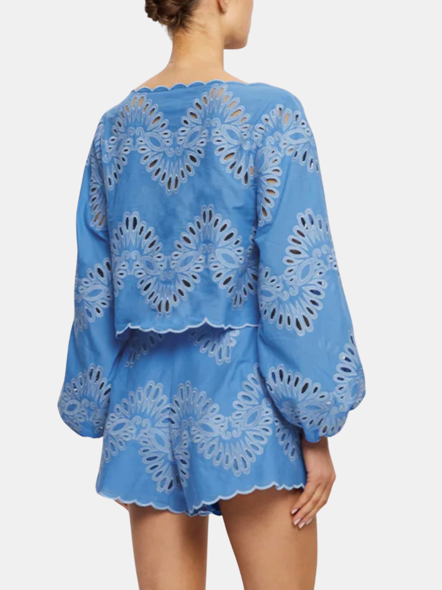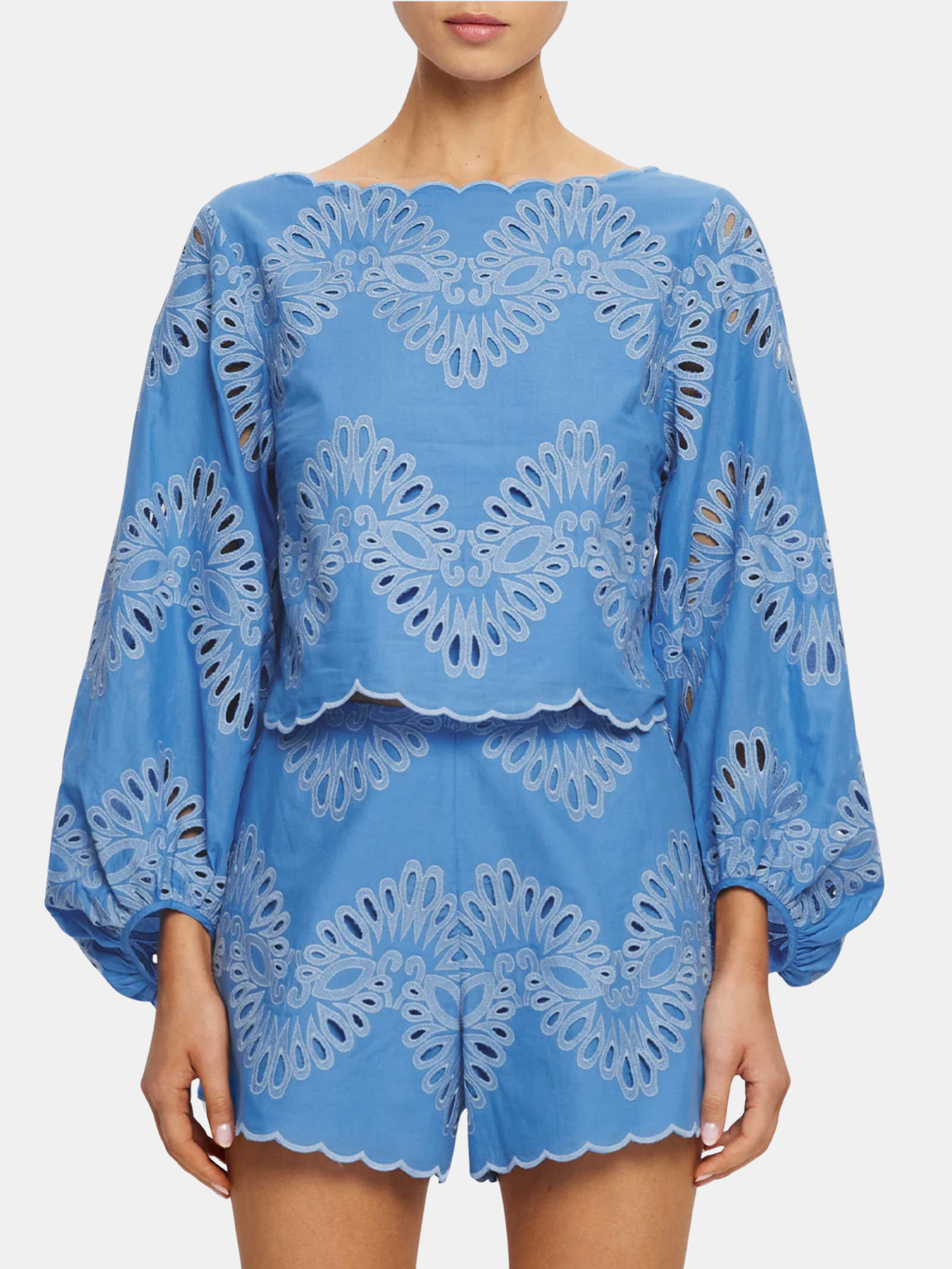 The Danielle Top is crafted from blue cotton broderie, featuring a wide boat neckline and long blouson sleeves, finished with a scalloped hem for a considered touch. Designed for light, effortless wear. Pair with the matching Danielle Short for a coordinated look, or style with denim and sandals for easy daytime dressing. Shown in Ivory and Blue.