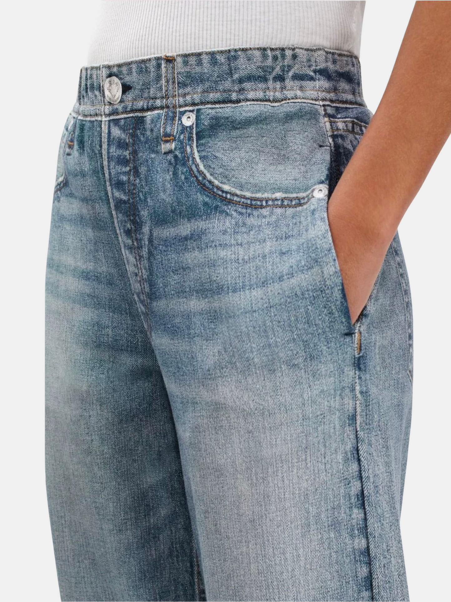 These wide-leg pants are cut and sewn from cotton terry cloth that's ultra-soft on the inside and printed on the outside to look like your favorite jeans. Featuring a pull-on elastic waistband and side seam pockets, the mid-rise style further achieves its comfortable fit and feel with the other denim details digitally printed on the fabric. Shown in Scarlet.
