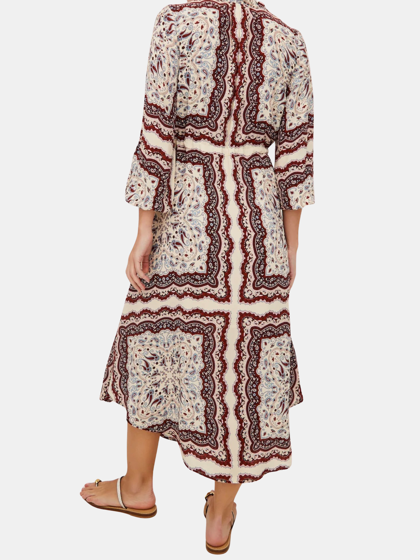 The Berkshire Dress is mountain chic meets city sophistication. Crafted from printed silk crepe, the gold metallic tie ends, partially lined skirt, and tie-neck detail offer a subtle shot of urban sophistication. This dress features a tunneled waist with self-ties for an adjustable, ultra flattering fit. Shown in Paisley Scarf Ivory.