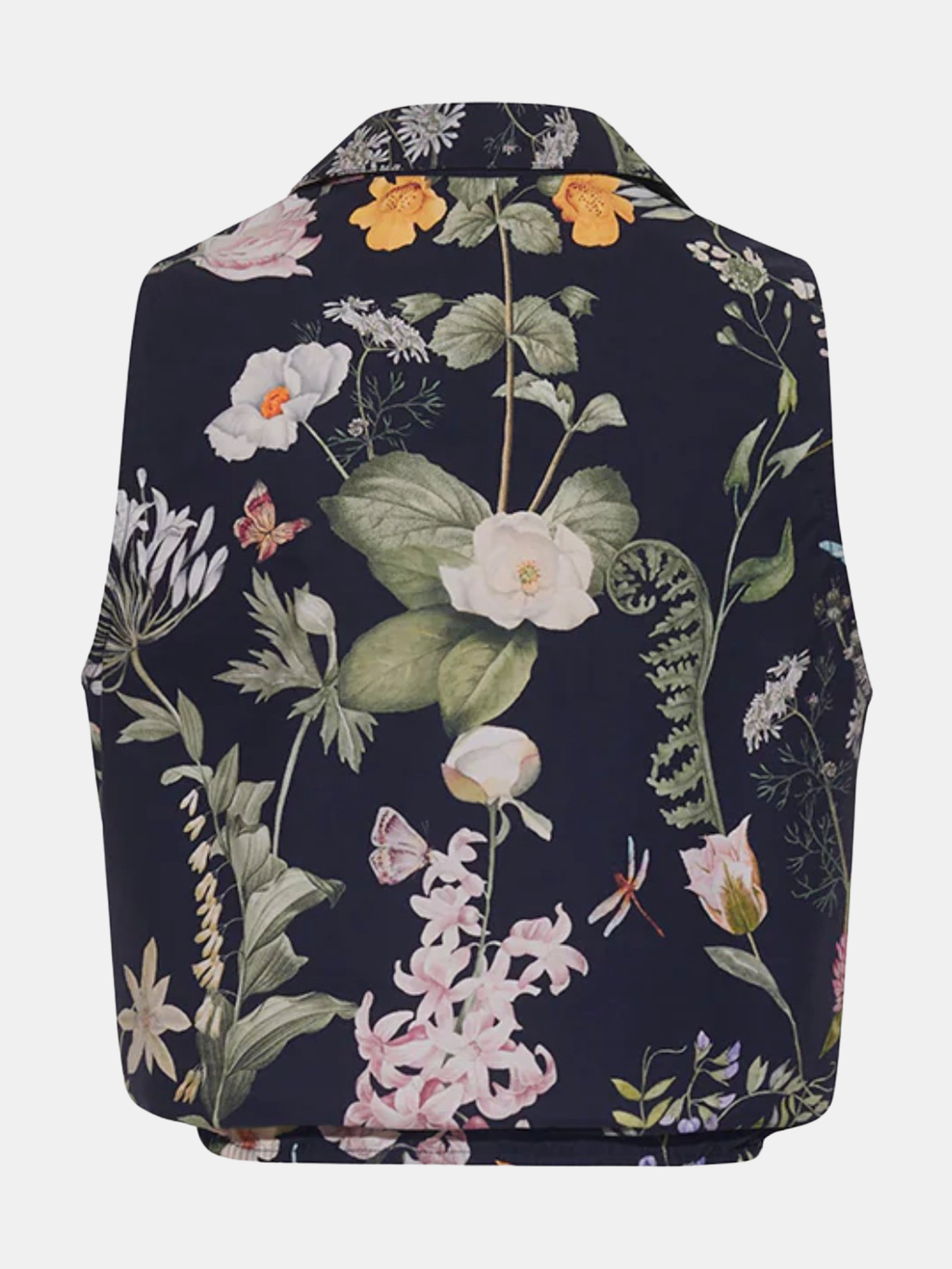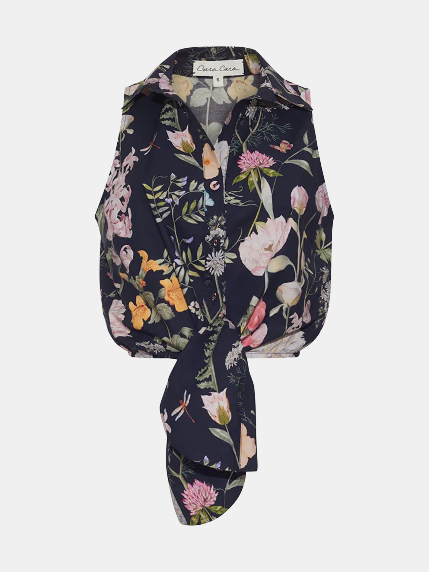 This sleeveless halter-neck shirt features an allover print and a functional center-front button placket. Designed for a customizable fit, it includes adjustable front ties and an elasticated back hem for added ease of movement. The sophisticated halter neckline transitions into a versatile bodice that can be cinched or loosened to your liking. Shown in Navy Bloomsfield.