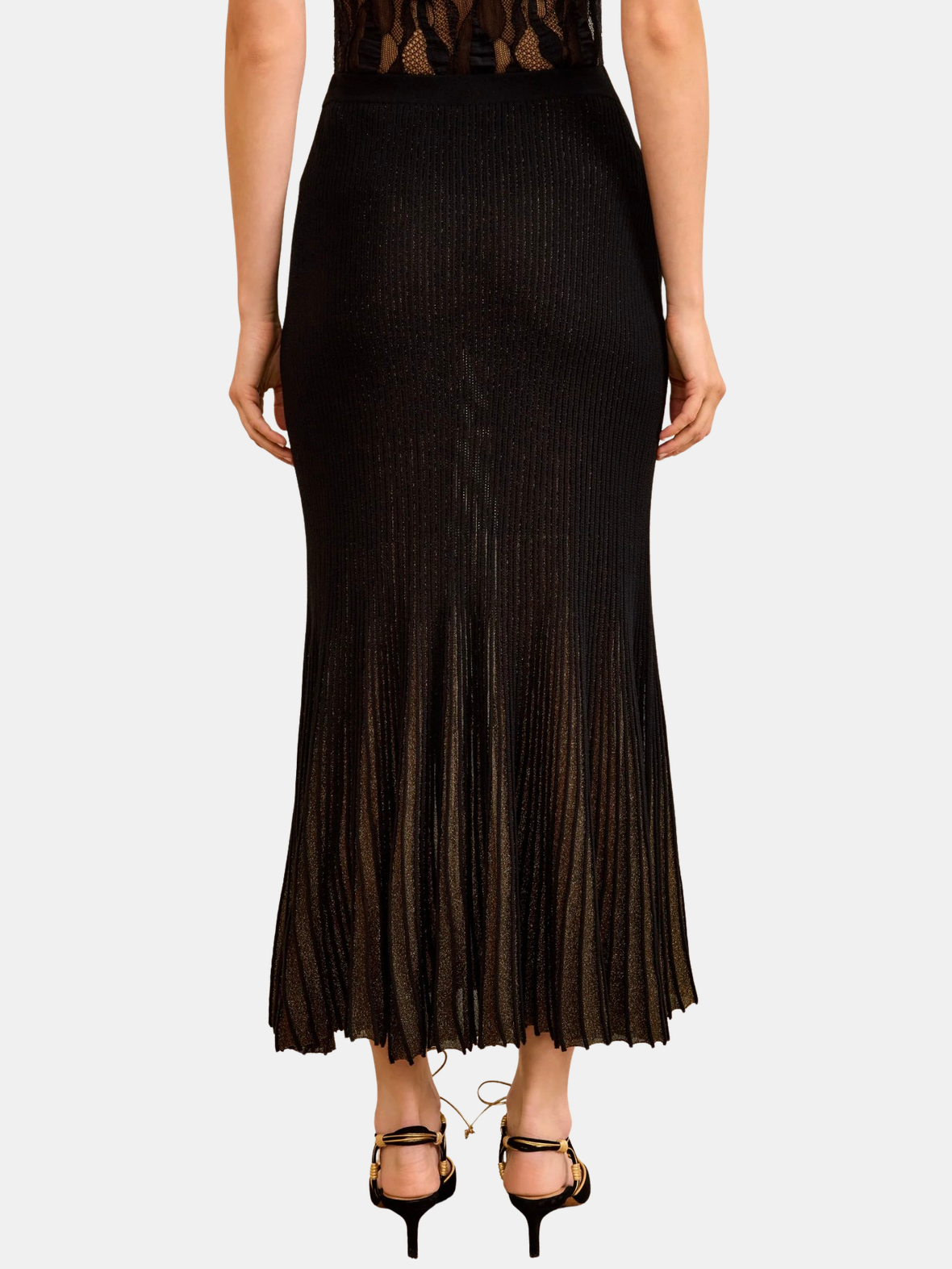 Designed with a pleated flared hem, the Vera Skirt lends poetic movement at every step. It is spun from signature sunburst knit in effortless black with lurex yarns that glimmer throughout. Pair with the Yulia Knit Turtleneck Top. Shown in Noir.