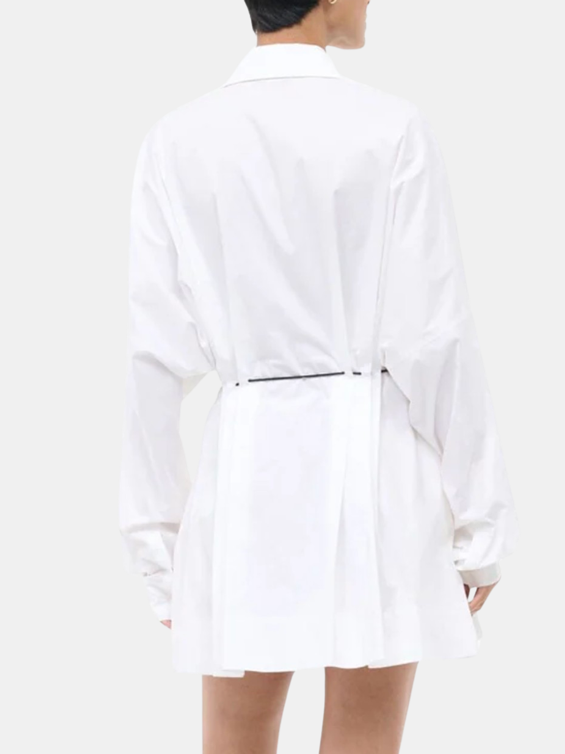 Crisp stretch poplin dress with a classic collared neckline and front zipper closure. Defined pleats and an adjustable waist tie create a flattering silhouette. Shown in White.