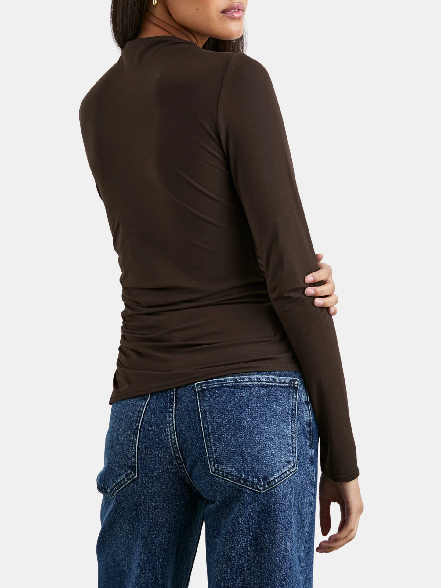 The Joelle top is a modern take on the classic long sleeve. Made from soft gauge jersey, this style features an asymmetrical mock neck with shirring details from the right shoulder. Shown in Espresso.