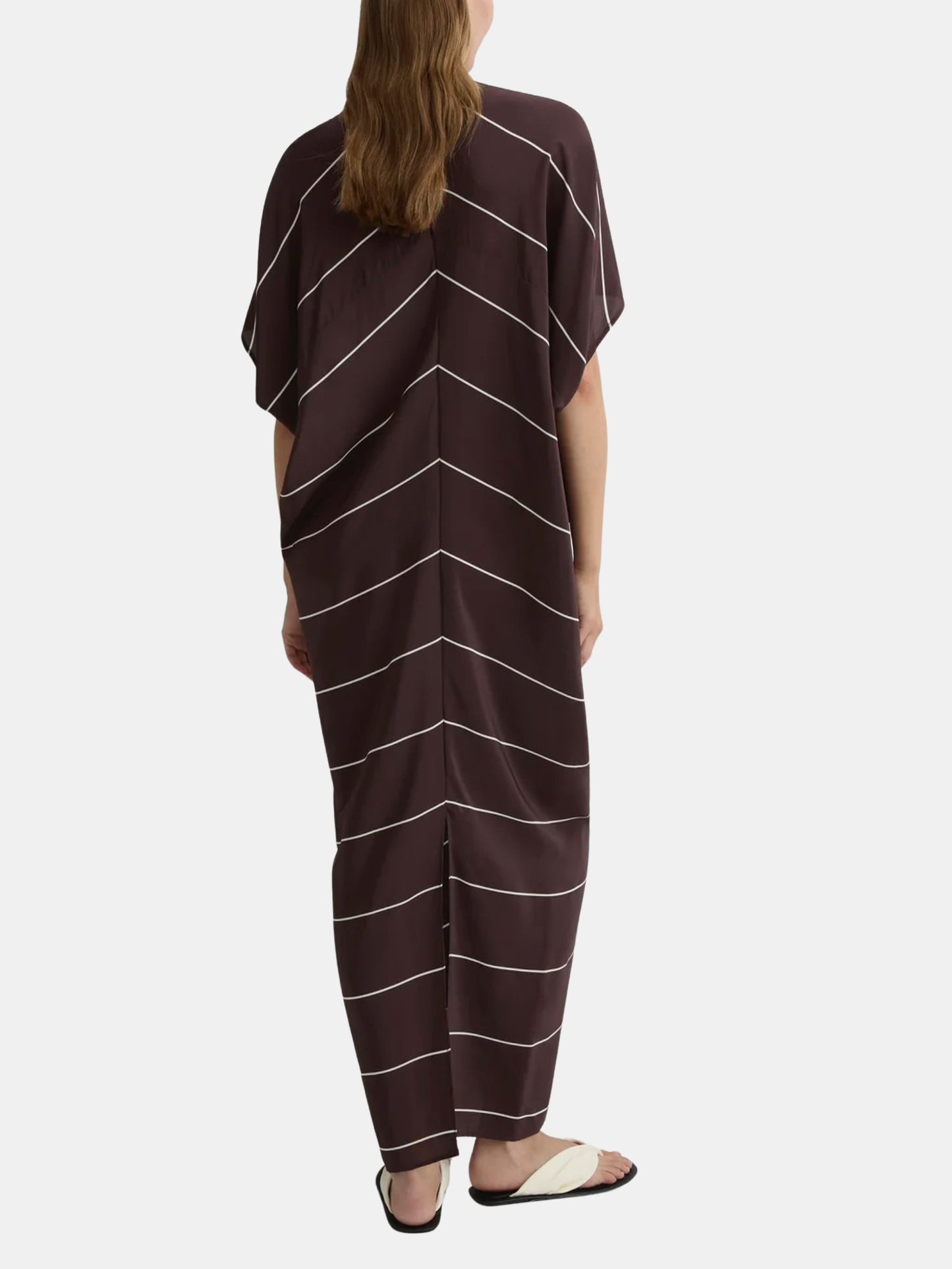 The Orta Silk Caftan Dress in Mocha Stripe is a relaxed yet refined silhouette, cut from 100% silk crêpe de Chine with a soft, fluid drape. Designed with an easy, oversized fit, this maxi-length caftan dress features a back split at the hem for movement and can be styled up or down with ease. A versatile piece that transitions effortlessly from resort days to evening occasions. Shown in Mocha Stripe.