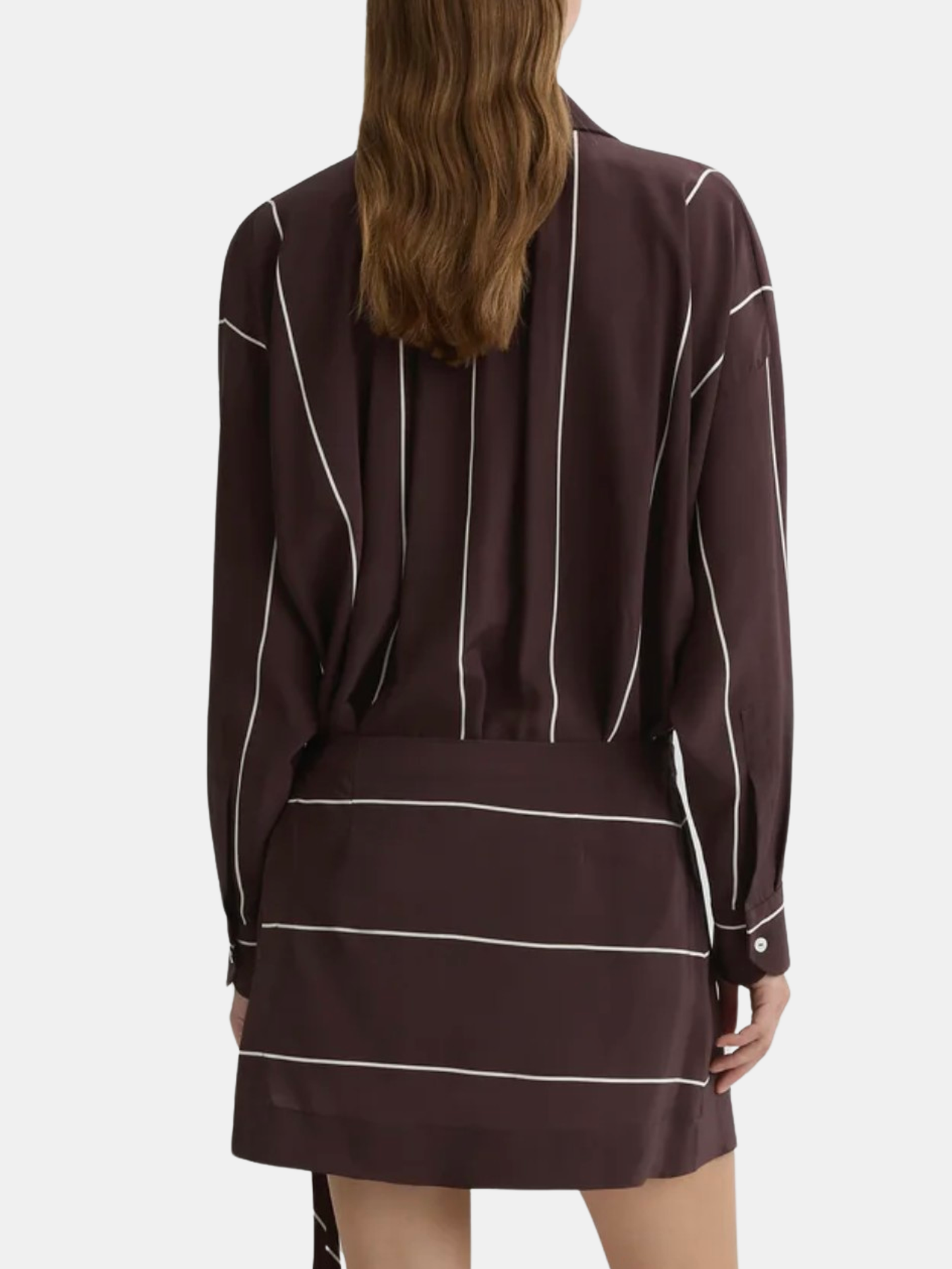 The Orta Silk Wrap Mini Dress in Mocha Stripe is a sophisticated take on the shirtdress, cut from 100% silk crêpe de Chine with a soft, fluid drape. Featuring relaxed dolman sleeves, shell button closure and cuffs, the silhouette is defined by its adjustable wrap skirt that ties neatly at the side. The contrast of a loose shirt top with a fitted, wrap-style skirt creates an elegant balance of ease and structure. Shown in Mocha Stripe.