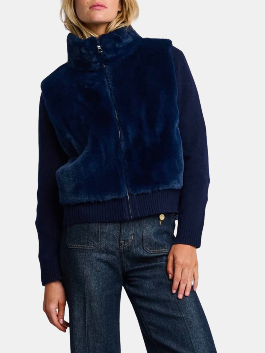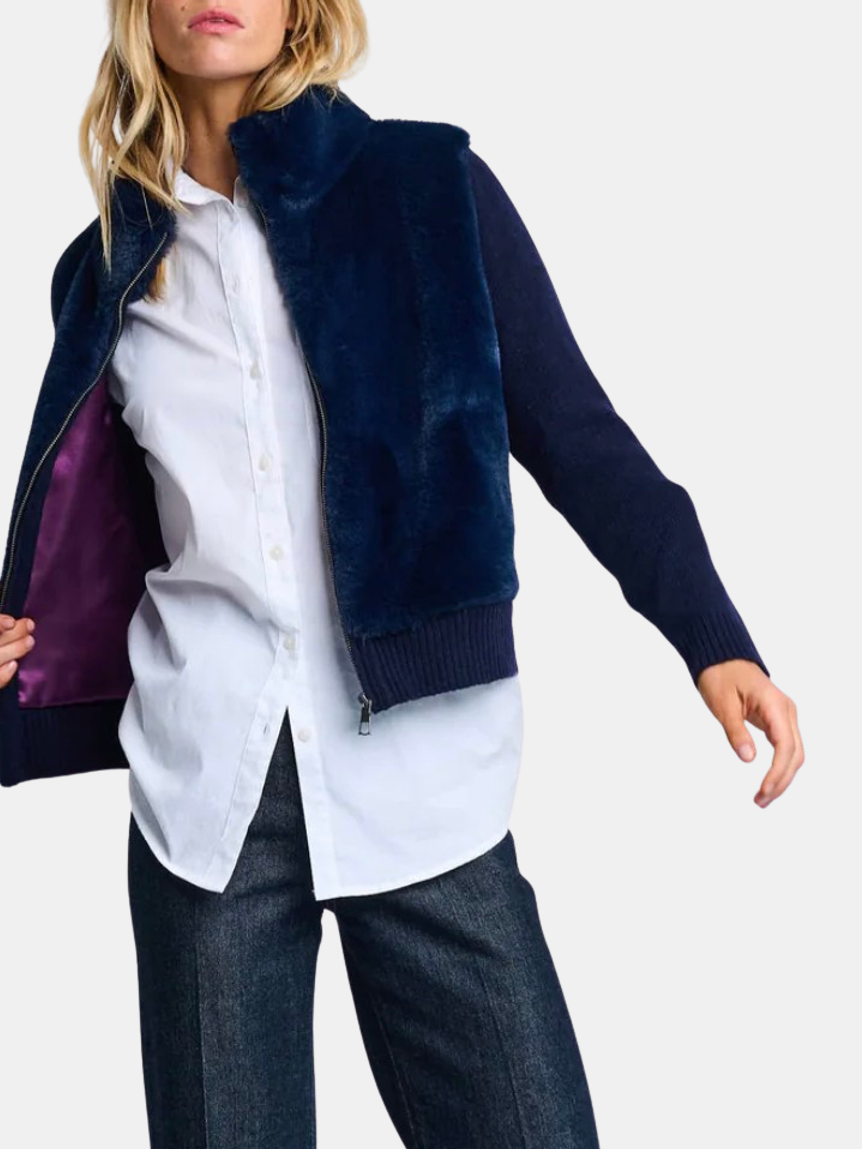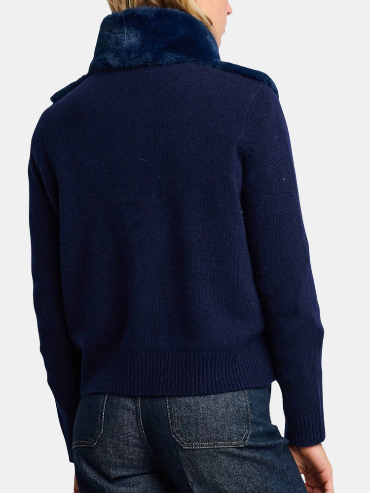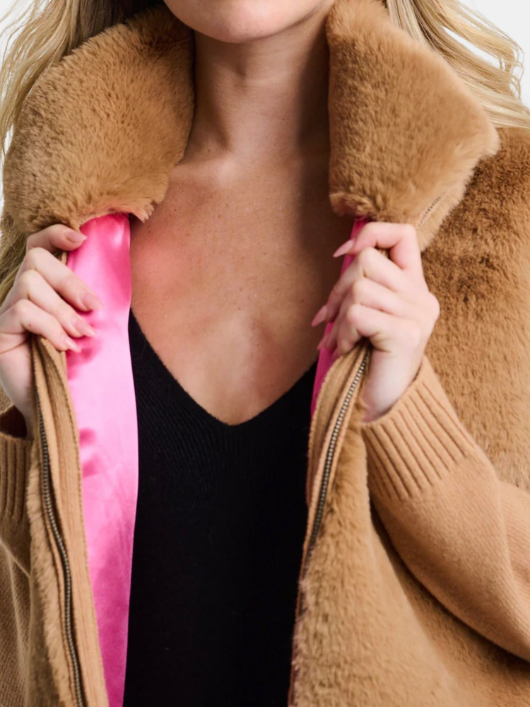 The Teddy jacket offers soft structure in a Wool blend with a high collar, ribbed cuffs, and cozy faux fur finish. Pockets and a contrast lining add utility and depth to this elevated outerwear essential. Shown in Camel and Navy.
