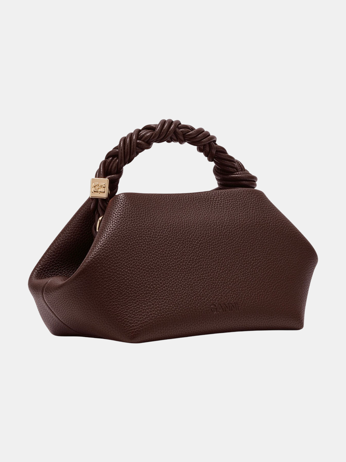 This bag features a tone-on-tone metallic GANNI Butterfly logo, a twisted handle with a braided knot, and a gold-tone metallic dice with a GANNI Butterfly logo engraved. The bag has an internal magnetic closure, a flat card pocket inside, and an adjustable and removable shoulder strap for crossbody wear. Shown in Chicory.