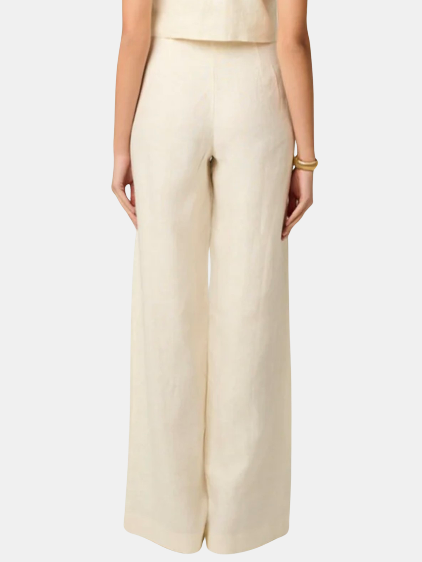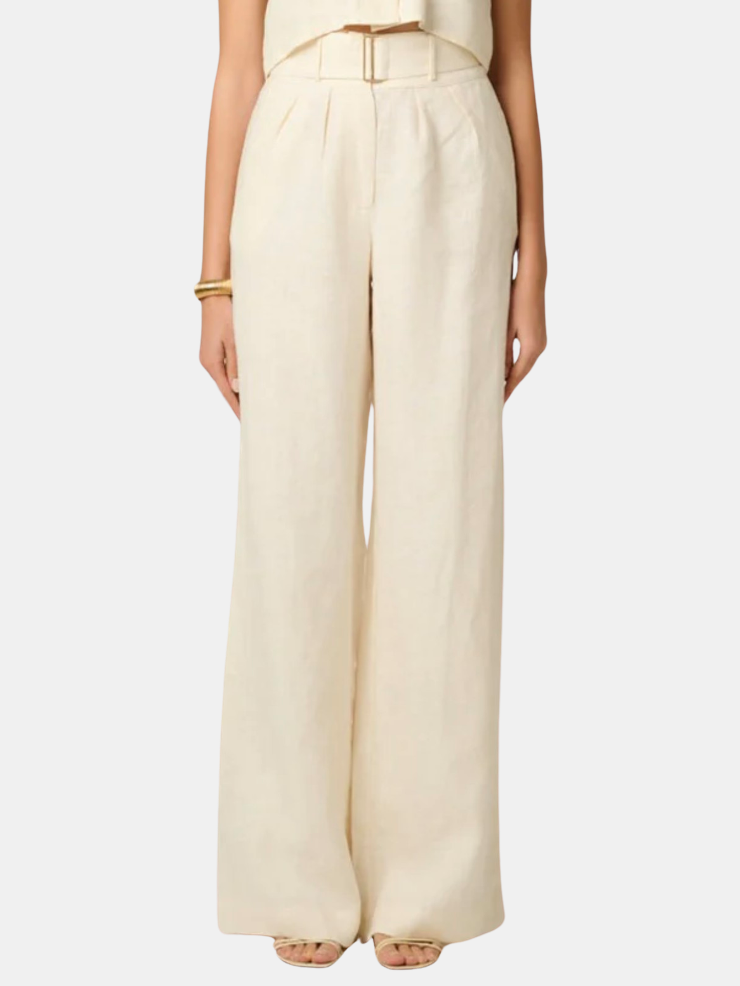 Cut from our signature 100% linen, the Alina pant features a fitted, high rise waist, pleated front, and zip and button closure. A removable belt and wide-leg silhouette finalize the look. Pair with the Sloan Linen Vest. Shown in Rose Quartz, Chocolate, Ivory, and Indigo.