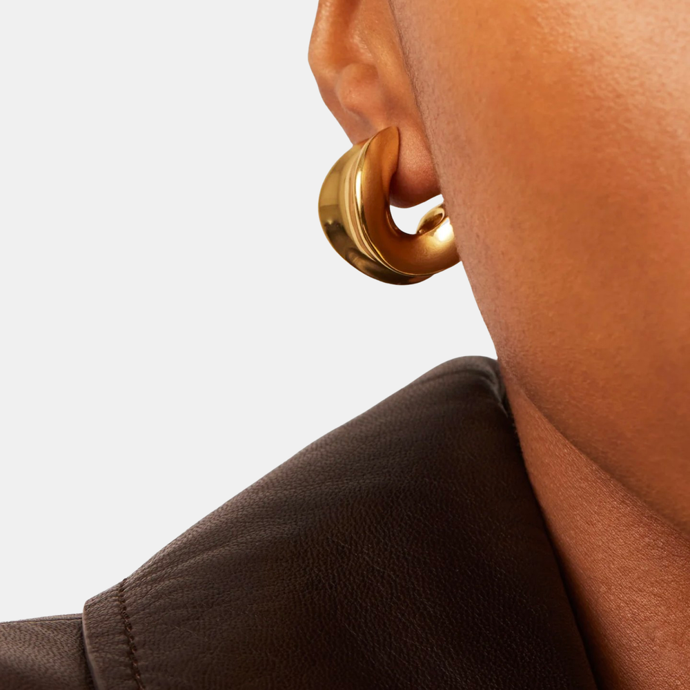 A wide, chunky pair of hoop earrings featuring sculptural curves and a rounded tail, as seen on Hailey Bieber and Aubrey Plaza. Despite their bold body, they are lightweight, thanks to a hollowed-out design. Finished in high-polish 14k gold. Shown in Gold.