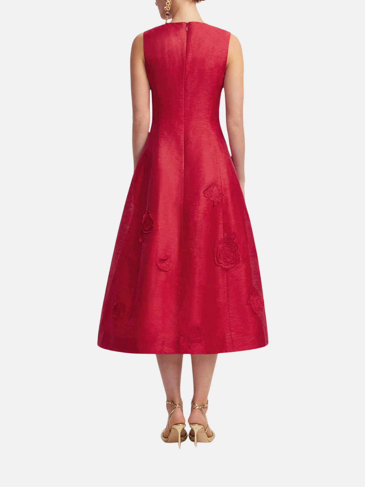 Crafted from a premium linen blend, this midi dress features an elegant A-line silhouette with a fitted waist and a classic round neckline. The piece is defined by intricate laser-cut embroidery and 3D handcrafted floral appliqué, offering a rich, tactile finish. It is fully lined for comfort and finished with a seamless invisible back zip closure. Shown in Scarlet.