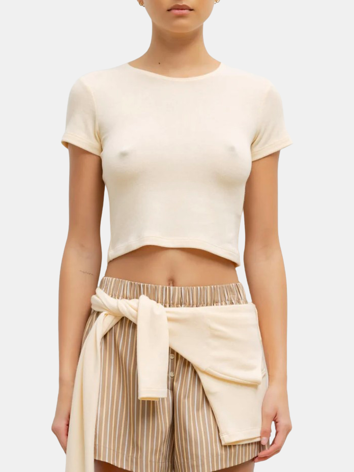 Cut in our buttery soft Lauren Sweater Jersey, the Lauren Crop Slim Fit Tee is a classic crewneck t-shirt cropped at just the right length. Shown in Black and Vanilla.