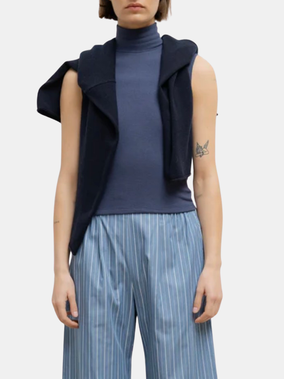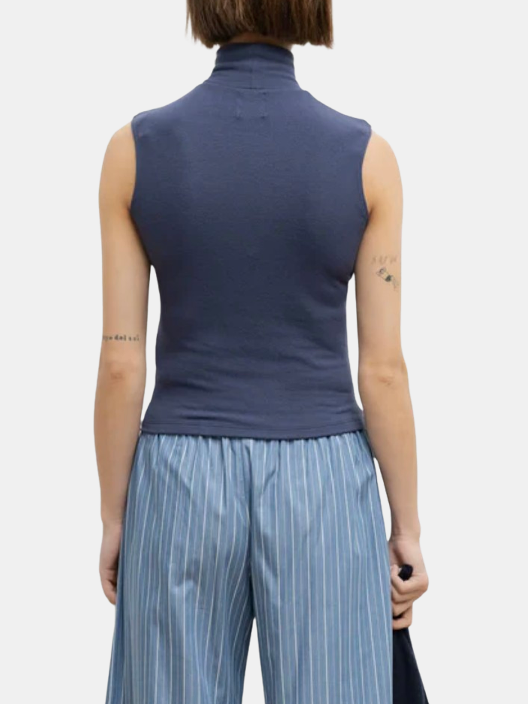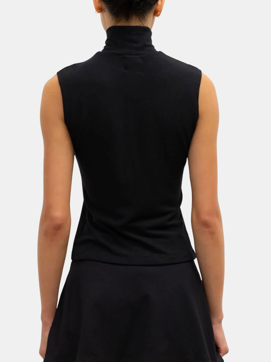 A foundation staple. Cut in a buttery soft brushed sweater jersey, The Lauren Sleeveless Turtleneck features a slightly fitted silhouette and a flexibly styled turtleneck. Shown in Chocolate, Black, and Marine.