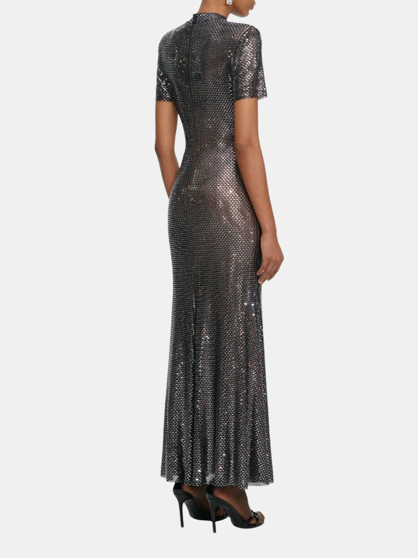 Dazzling rhinestones electrify this gunmetal mesh midi dress. Cut with an effortless t-shirt silhouette that skims the body – style with stilettoes for a futuristic twist on minimalist party chic. Shown in Grey.