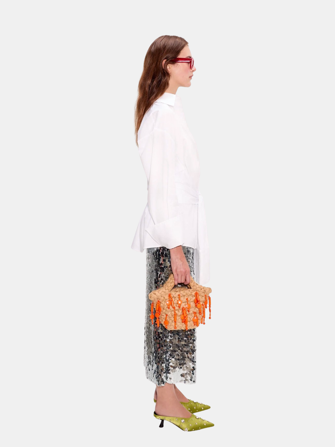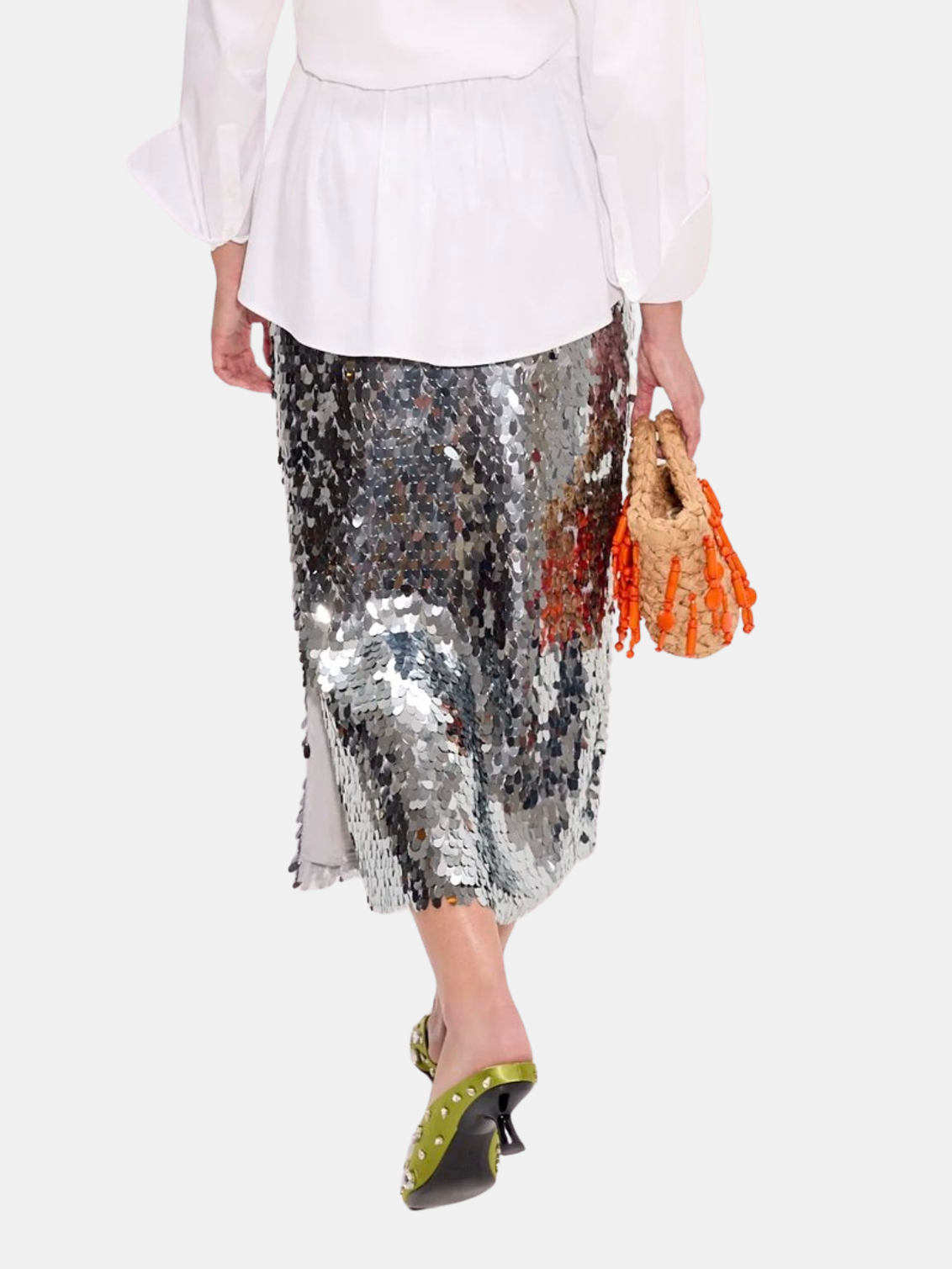 Midi-length skirt covered in teardrop sequins in satellite silver. Fully lined with a smooth finish and fluid movement. Pair with the Shirley Sequin Top. Shown in Silver.
