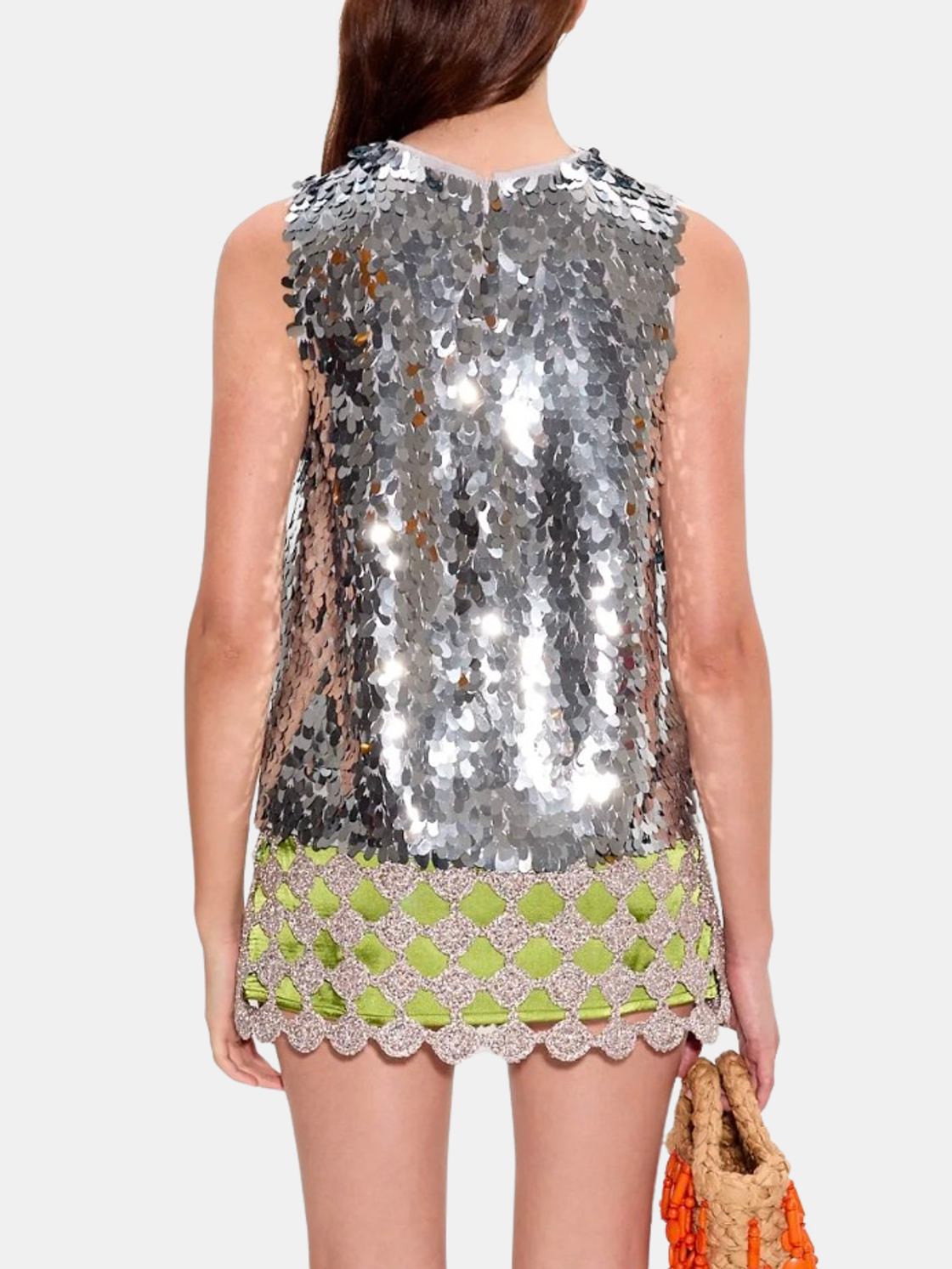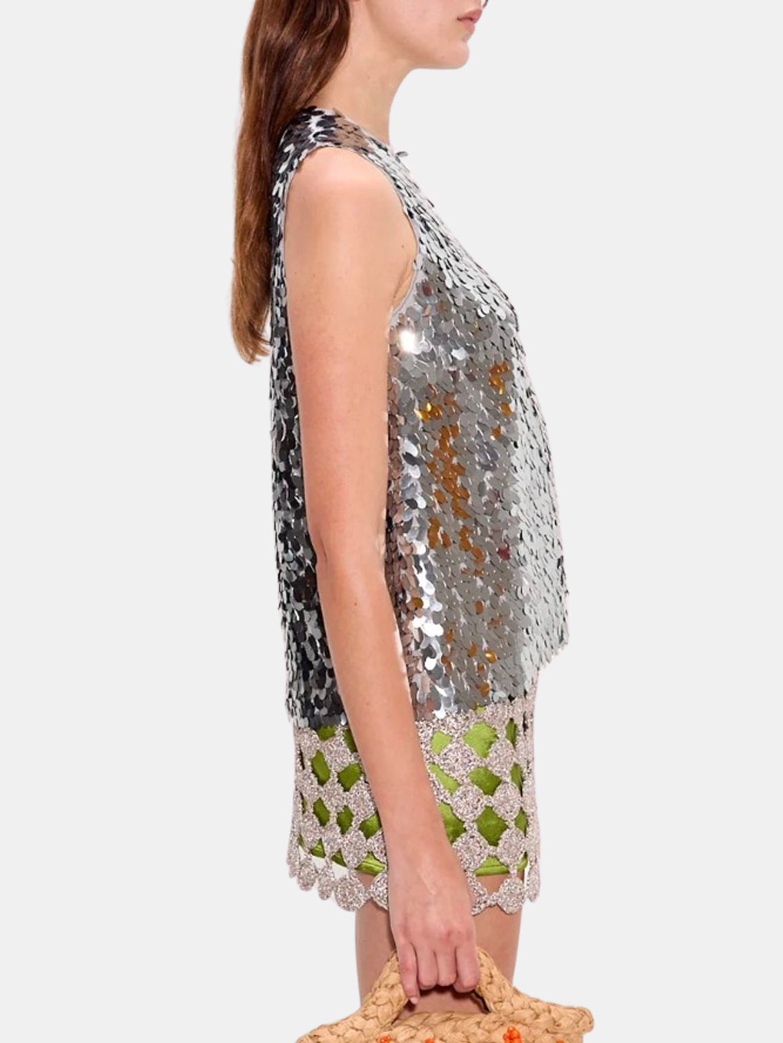 Sleeveless top covered in teardrop sequins in satellite silver. Features a flattering longline fit with full lining for comfort and shine. Pair with the Mia Sequin Skirt. Shown in Silver.