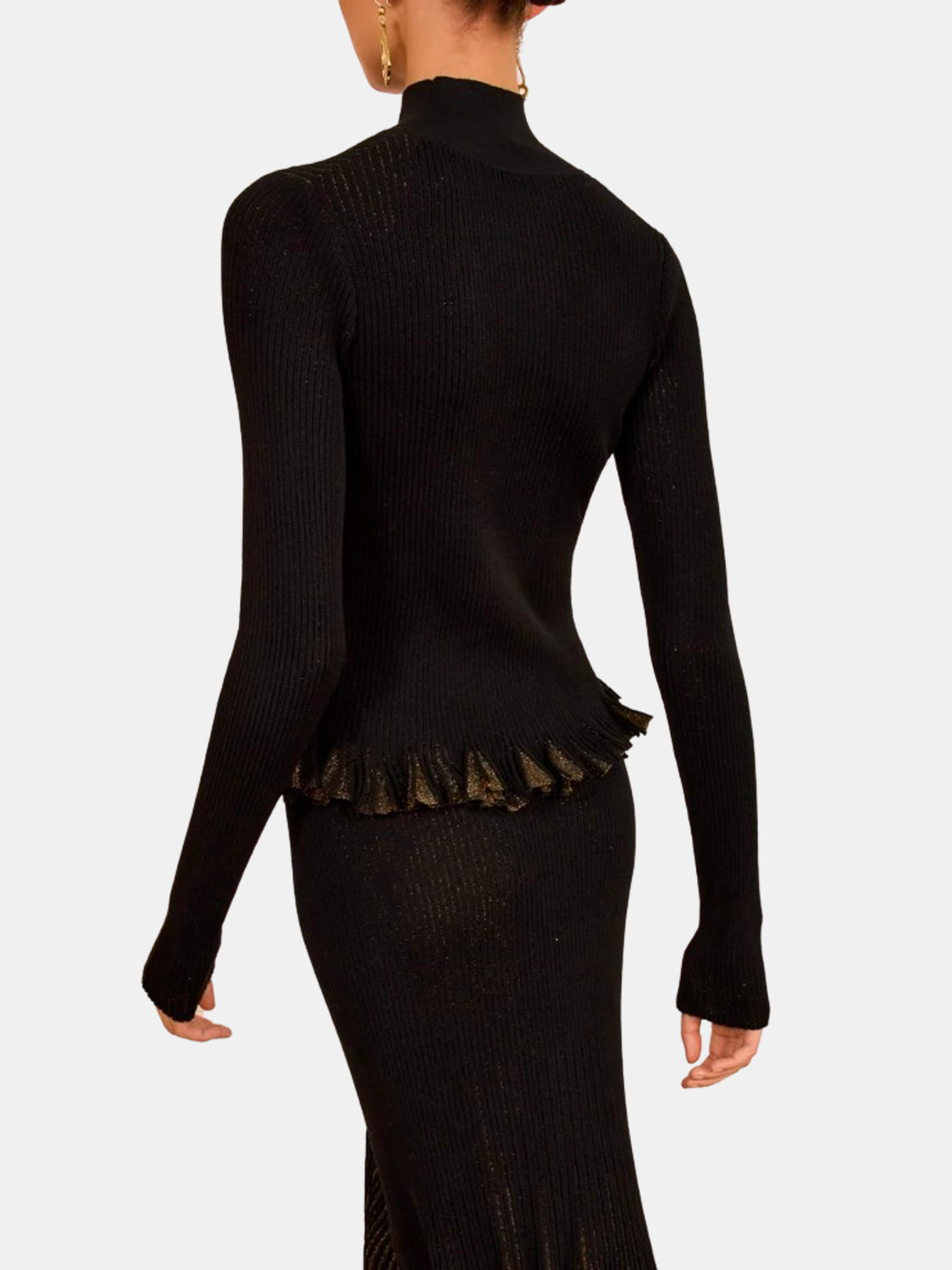 The Yulia Top is an elevated, cold-weather essential spun from signature sunburst knit with black and shimmering lurex yarns. The slim fit is ideal for layering, while the ruffled hemline adds playful dimension. Pair with the Vera Skirt to complete the look. Shown in Noir.