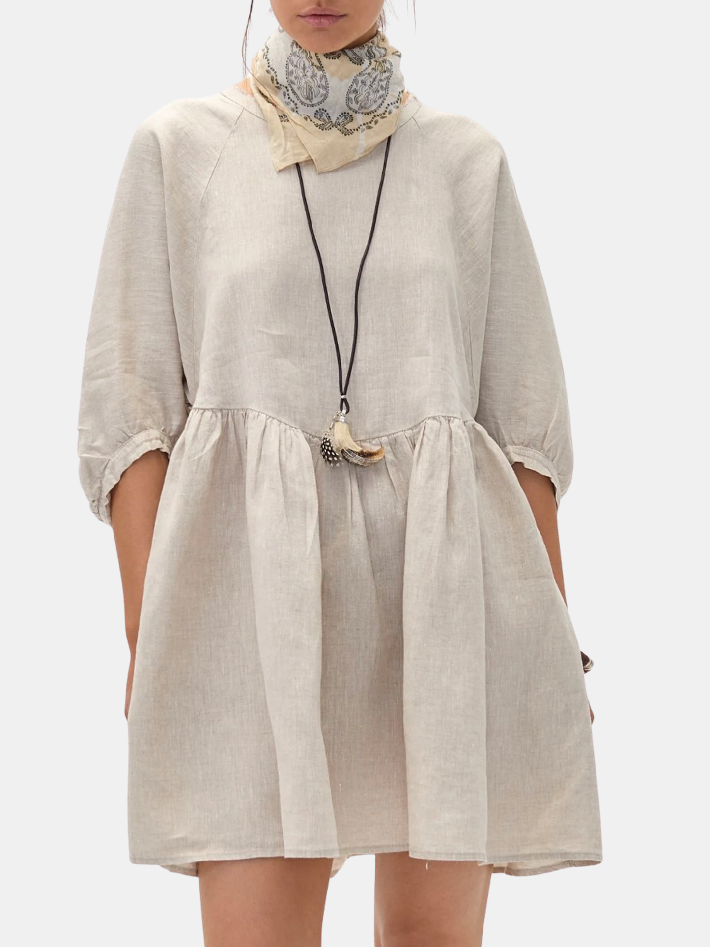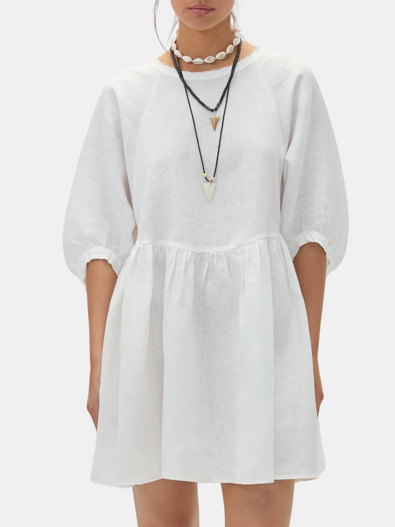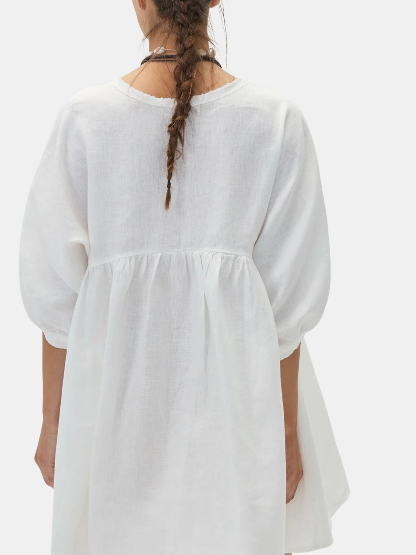 The oversized Alcala Linen Dress is both playful and feminine. Crafted from Lanhtropy's signature 100% natural linen, it stands as the ideal mini dress for this sunny season. It features puffed raglan sleeves and offers ample movement, thanks to strategic pleating at the waist. Shown in Black, Off White, and Natural.