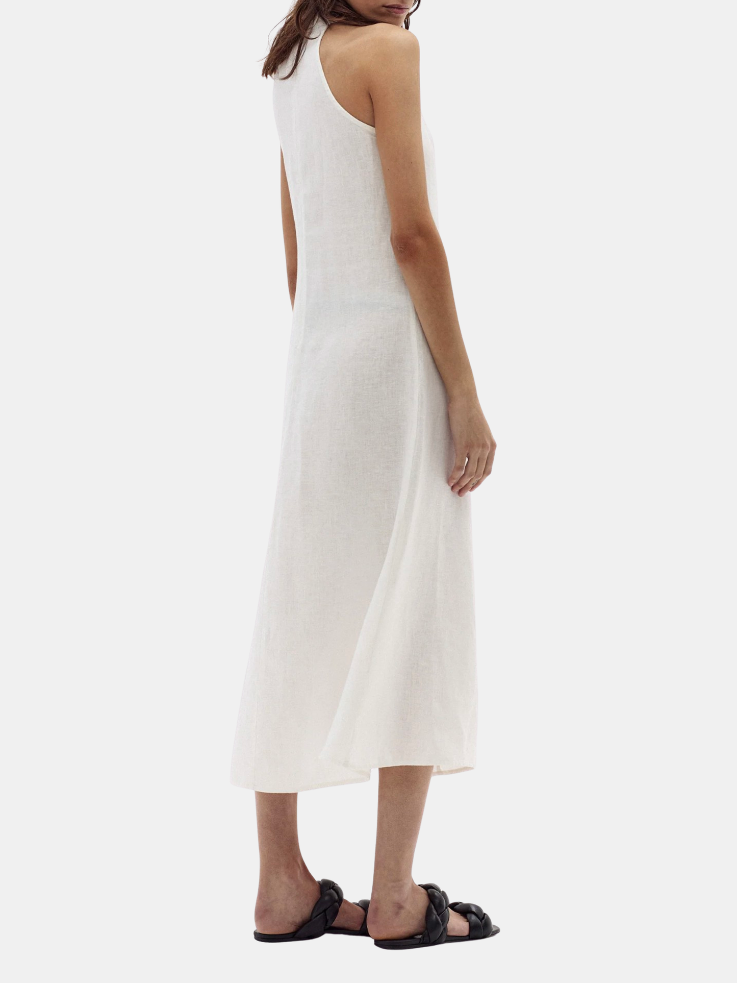 The Olivia midi linen dress falls from a high, halter neckline, into a sleeveless, feminine silhouette combining timeless details. Hidden back zipper and neck button-loop closure. Perfect for a fancy evening date or any special occasion. Shown in Off White.