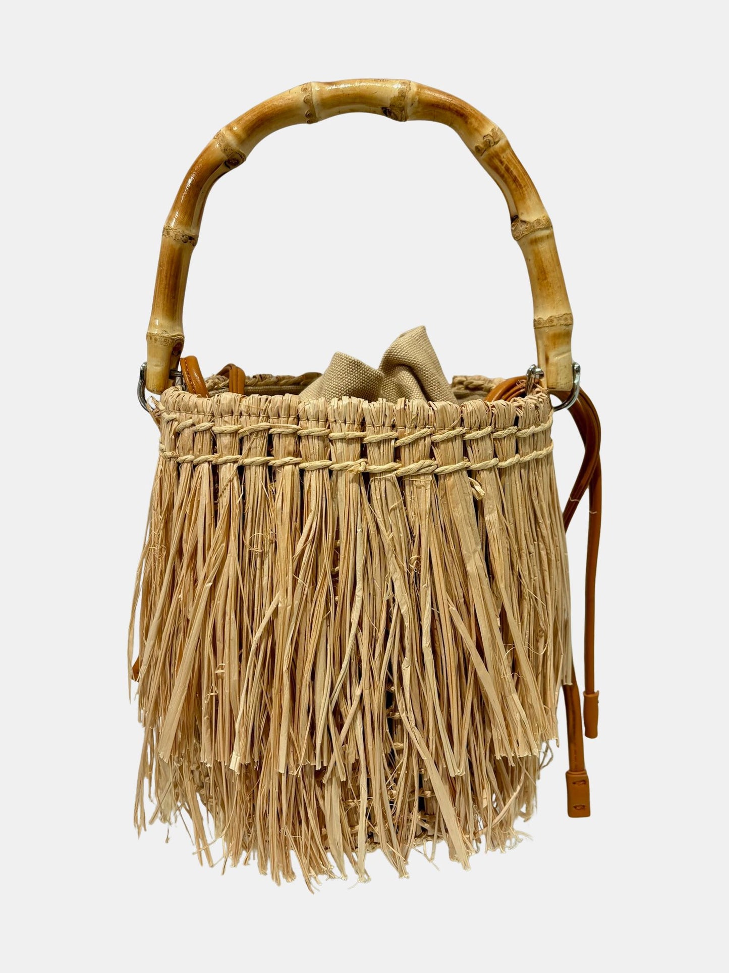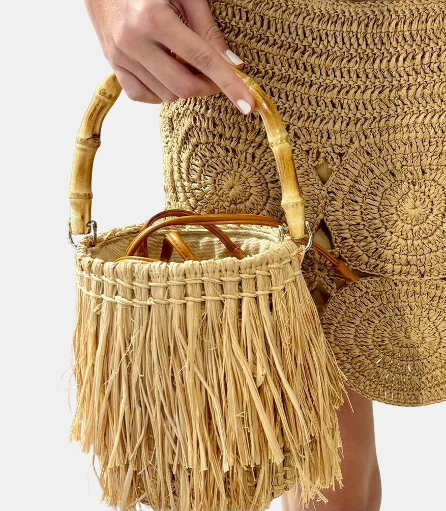 Suede moss green or raffia natural fringe bag with a natural bamboo handle. Compact, structured shape with soft texture and playful movement. Shown in Moss Green and Natural.