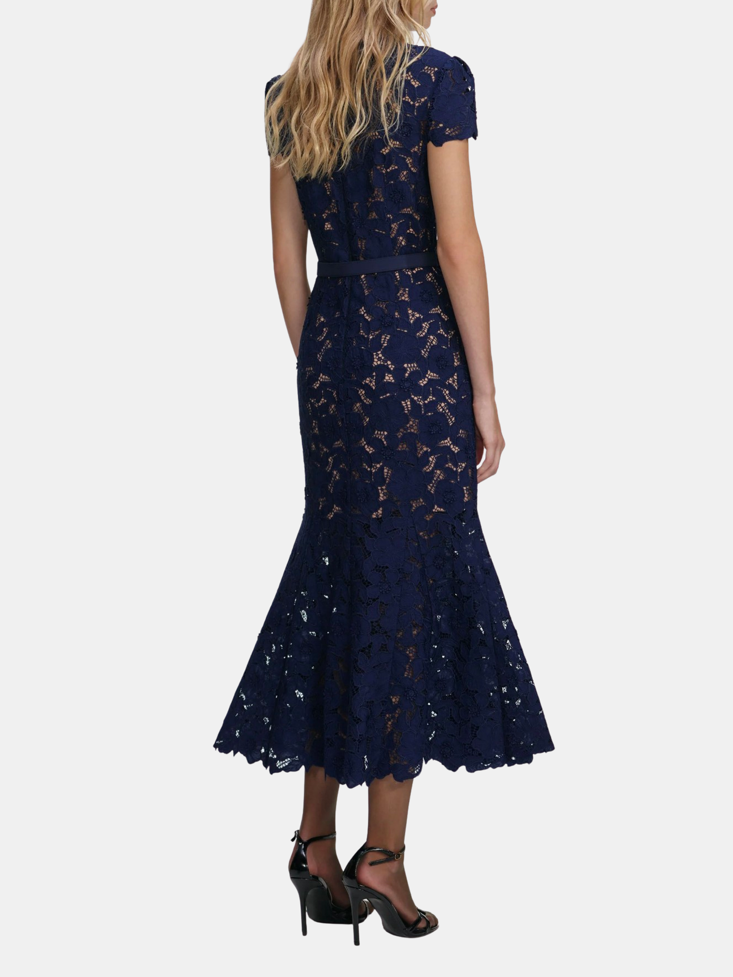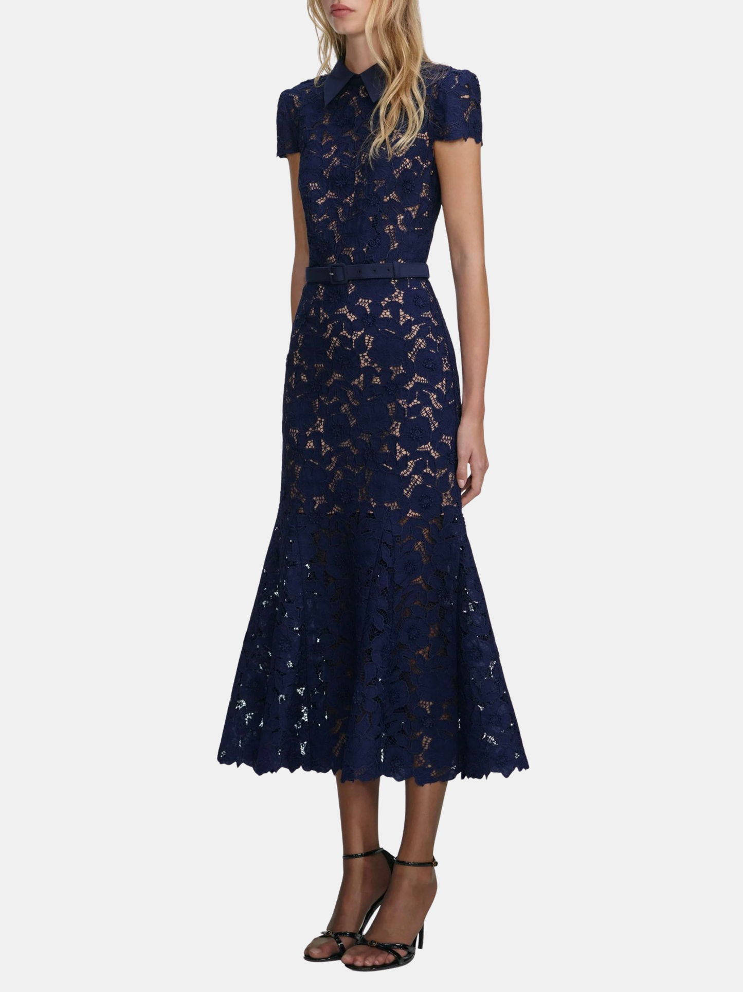 The timeless tones of navy meet signature guipure lace in this fit-and-flare midi dress. Framed by a revere collar and tonal belt, show off its dynamic hem with stilettoes on the dancefloor. Shown in Navy.
