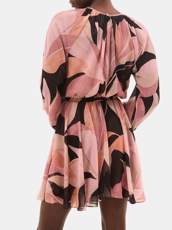 The Anthea Dress is a timeless mini, cut from chic Moody Abstract Flora printed chiffon. It features a high gathered neckline, long raglan blouson sleeves, and a keyhole button-back closure. An adjustable cinch-tie waist flatters the figure while flowing into a softly draped skirt and is fully double-lined for effortless wear. Shown in Moody Abstract Flora.