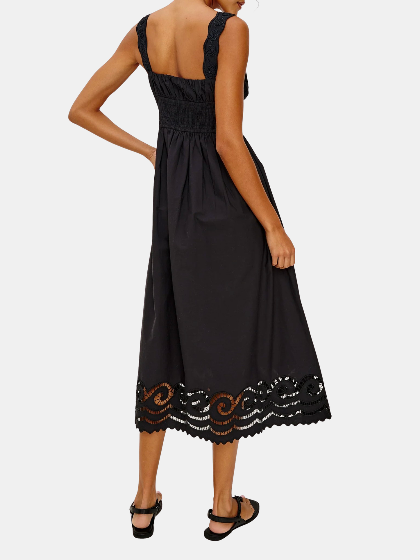 The Anadia is a maxi dress cut from crisp, lightweight poplin, featuring wide shoulder straps adorned with soutache swirls, a ruched bust, a smocked empire waist, and scalloped ladder embroidery at the hem. Shown in Black Embroidery.