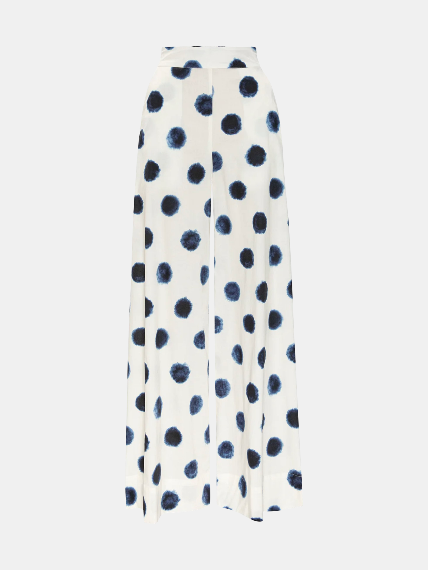 The Billie pant is a chic wide-leg silhouette cut from navy polka dot–printed cotton poplin on a white ground. Designed with a flat banded front, covered elastic back, and hidden side zip closure, it’s finished with double side slit pockets for ease. A breezy, timeless style to wear season after season. Pair it with the strapless Yassi top for a polished head-to-toe look. Shown in Polka Dot.