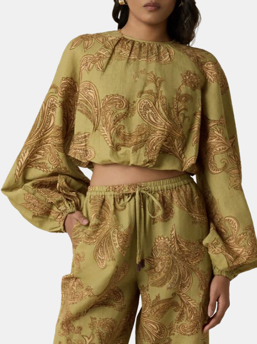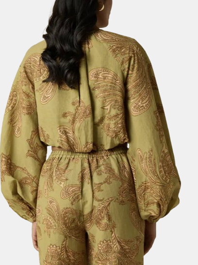 A playful silhouette for sunlit days- the Sakhi bubble hem top is crafted in breathable linen cotton and washed in a soft olive hue. This relaxed fit top is elevated with blouson sleeves finished with elasticated cuffs. The charming bubble hem adds a touch of modern whimsy, while the keyhole button closure at the back ensures ease of wear. Fully lined and adorned with an iconic paisley motif print. Shown in Olive.