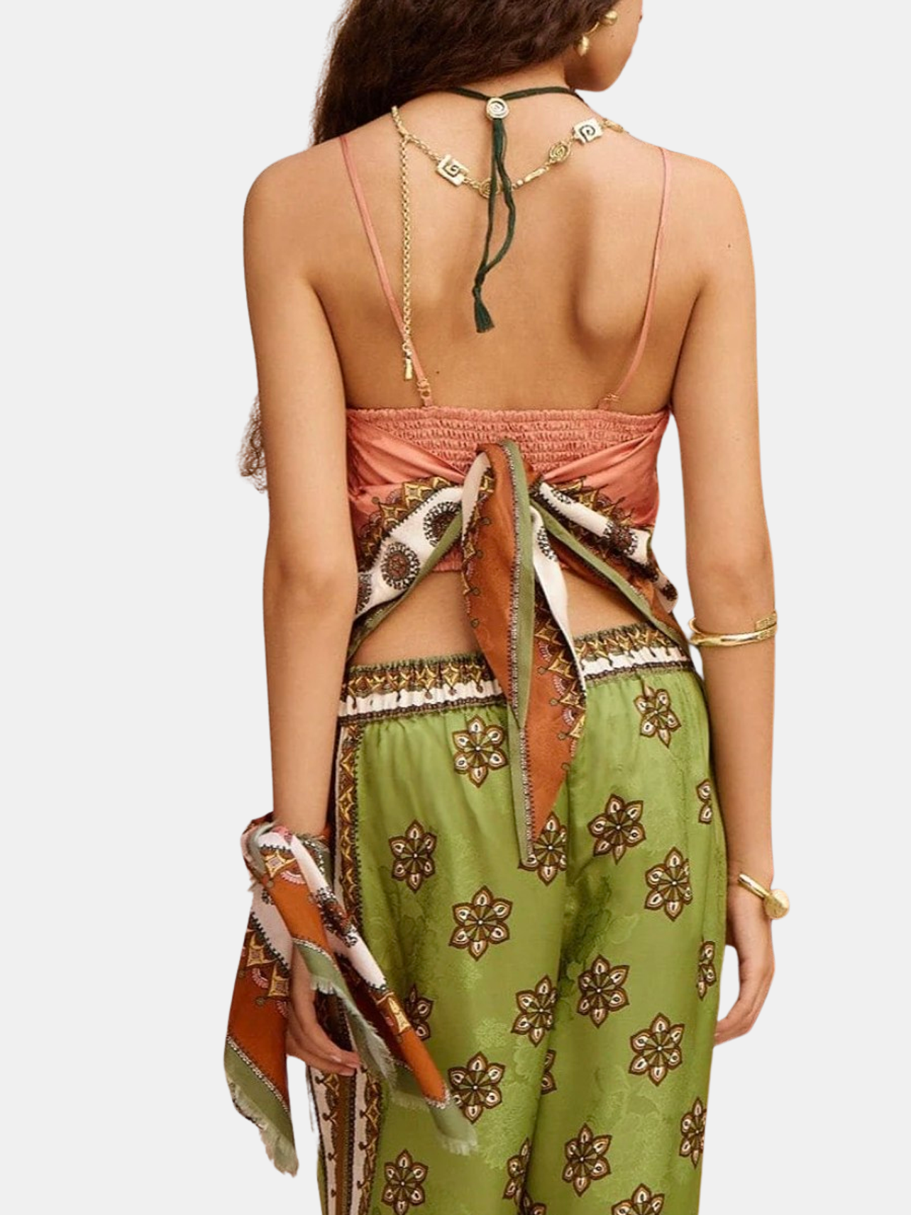 The Contina Scarf Top is a square neck top with adjustable straps. It features a tie back with shirred elastic panel for a comfortable, customized fit. Pair with the Contina Pant for a coordinating look. Shown in Multi.