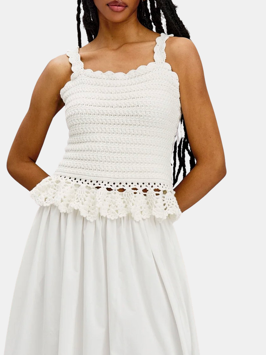 The Estefania fitted top stands out in an exceptionally soft crochet cotton fabric. Delicate details include scalloped straps and a ruffled crochet hem. Shown in White.