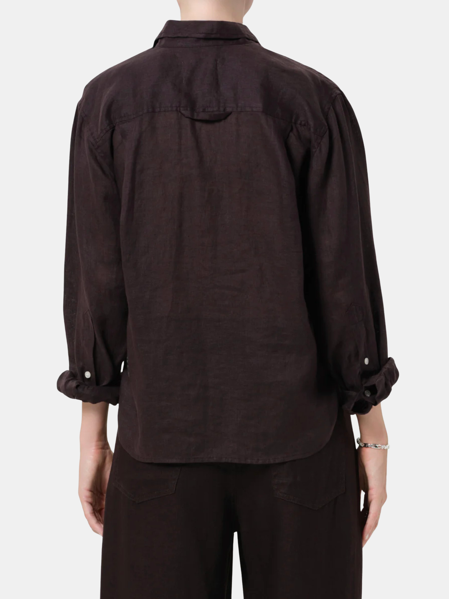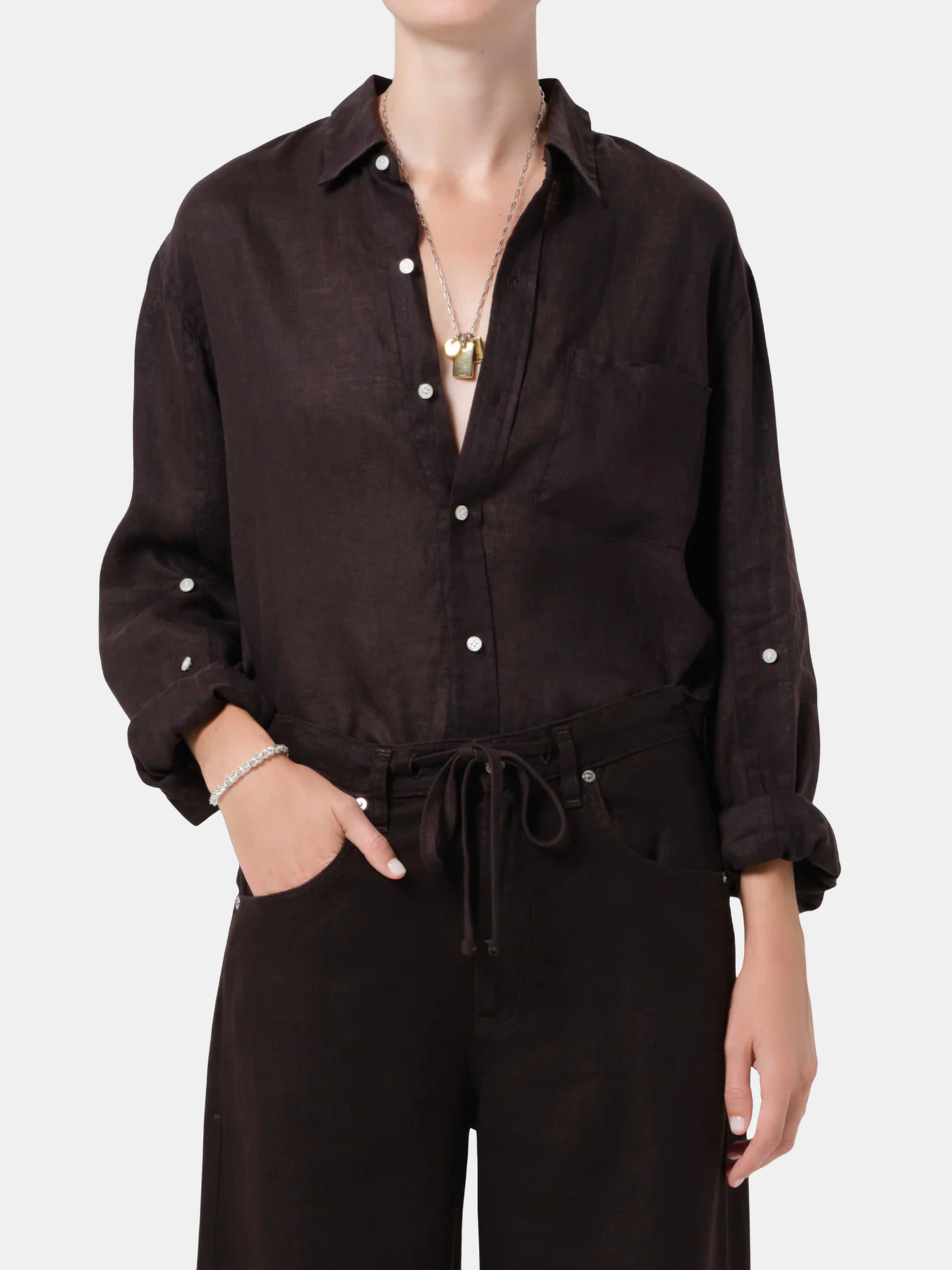 The Shrunken Kayla Shirt reimagines the classic button-down with a more tailored, cropped fit. Crafted from super lightweight linen, it’s ideal for layering over swim or pairing with your favorite travel pieces. The oversized silhouette is redefined with a high-low hem, adding a modern twist to this timeless staple. Versatile and effortlessly chic, it’s perfect for creating polished, laid-back looks year-round. Wear with the coordinating Brynn Drawstring Trouser. Shown in Chocolate and Vanilla.