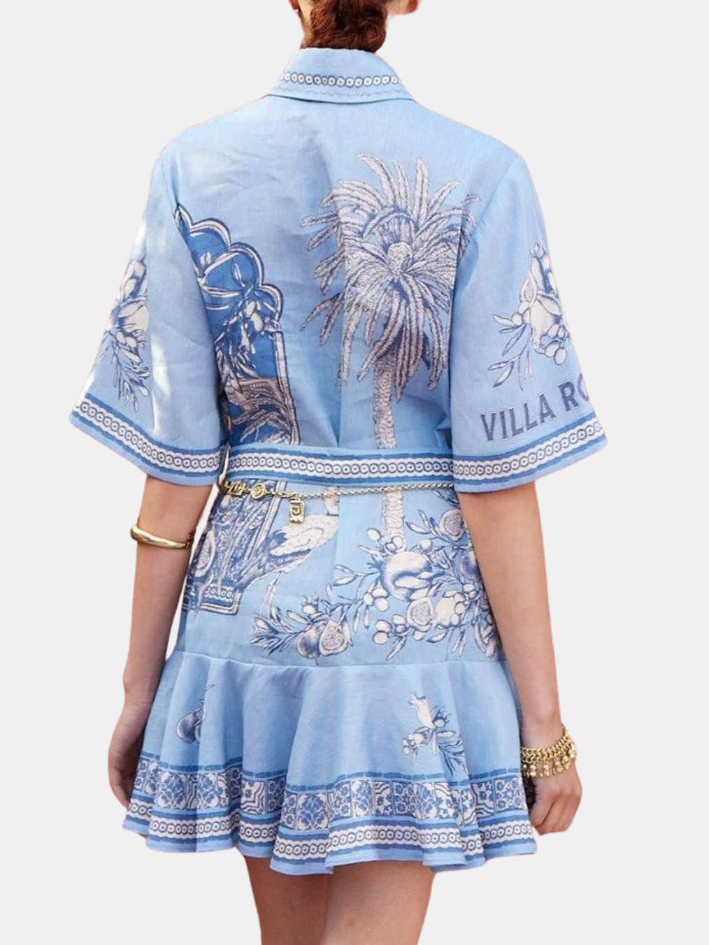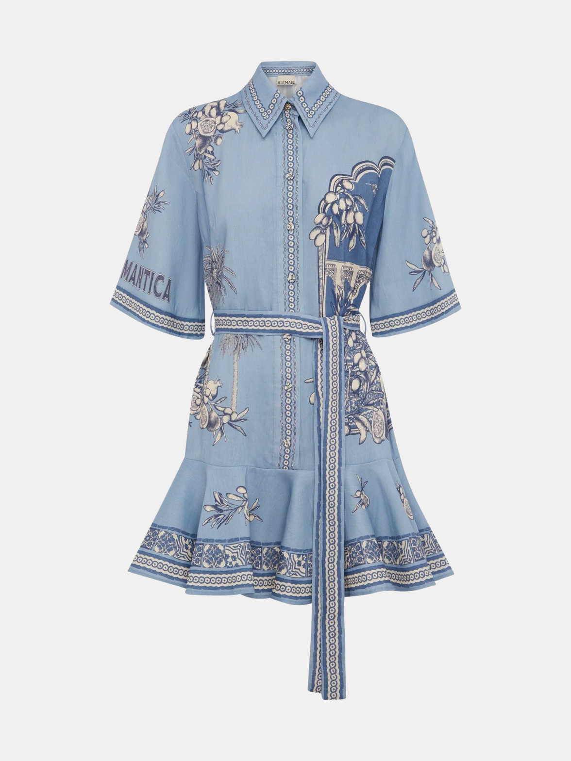 The Villa Romantica Mini Dress offers a breezy, effortless style with its relaxed mini shirtdress silhouette. It features a classic point collar and stand and is beautifully detailed with an embroidered motif. The front placket is accented with raffia buttons, and the waist is cinched by a self-tie belt. The shape is finished with a feminine flare skirt and functional in seam pockets. Does not include gold chain belt. Shown in Blue.
