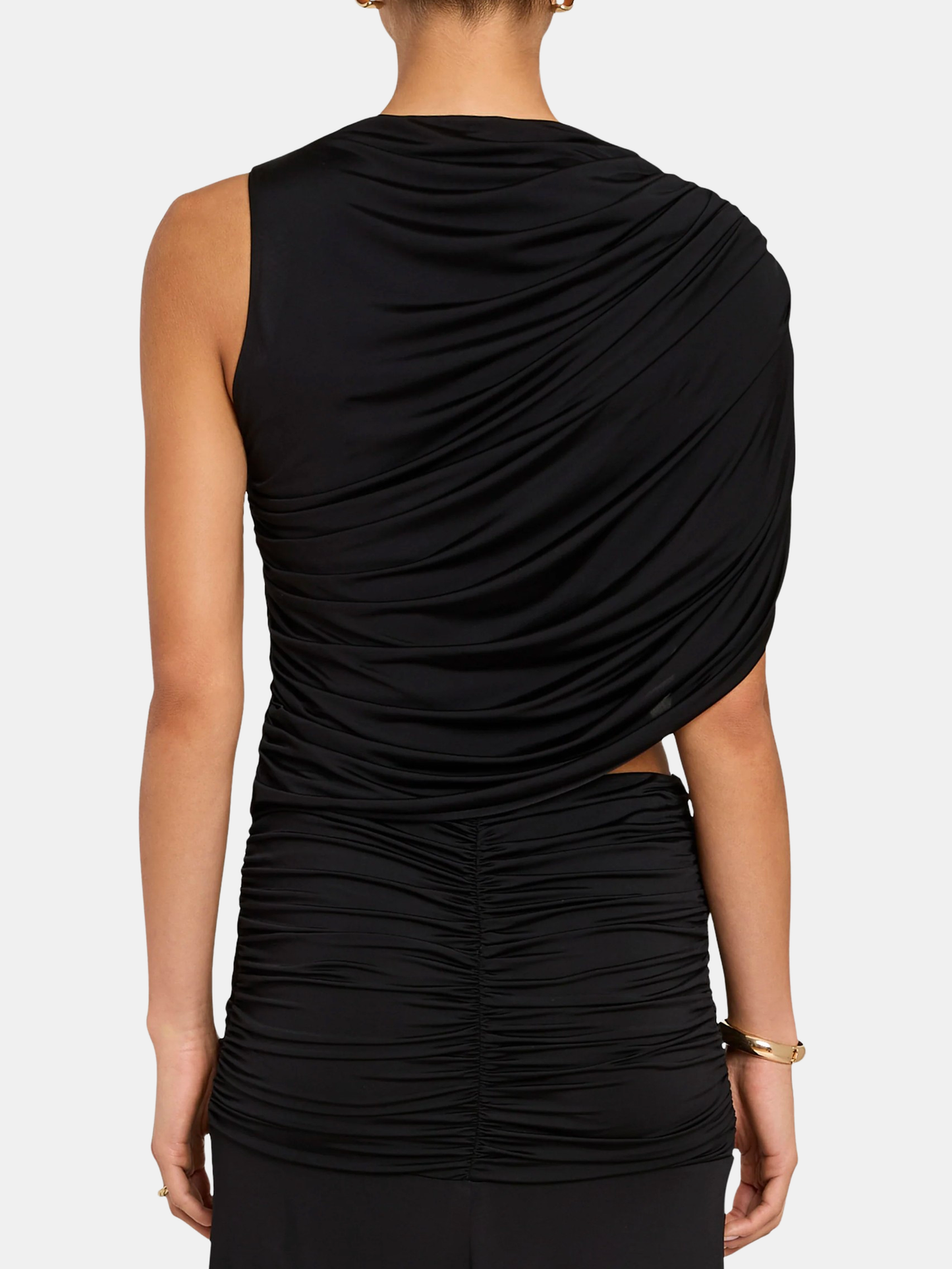 Prepare to be noticed in the Leo Top. Designed with a high neckline and draped detail across one arm, it’s a timeless statement piece. Shown in Black.
