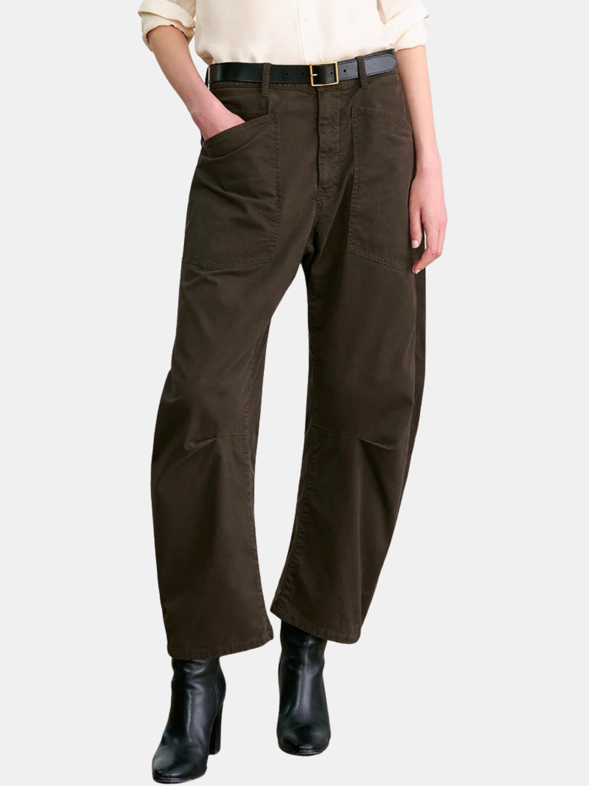 Mid-rise, relaxed fit barrel leg pant. Uniquely curved silhouette. Seam detail at knees. Gusset at inseam. Zip fly. Hidden hook-and-bar closure. Hidden stay button closure. Top-stitched front and back patch pockets. Belt loops. Shown in Midnight and Chocolate.