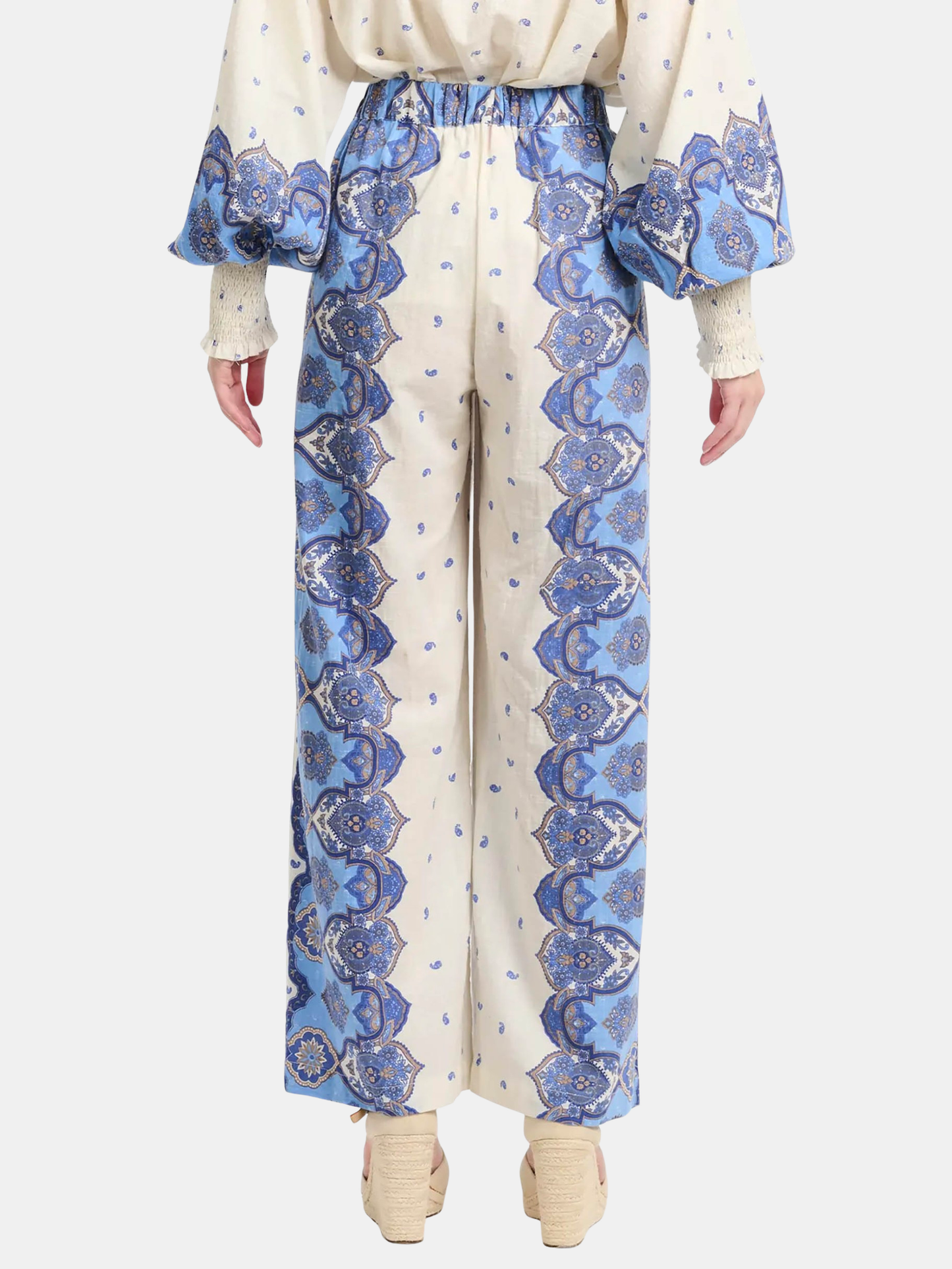 The Tais Pants in cotton present fluid palazzo cut adorned with Mediterranean blue Paisley print. High elastic waist and side pockets combine bohemian chic style and freedom of movement. Versatile, worn from day to evening, alone or coordinated with the Viki Shirt. Shown in Blue.
