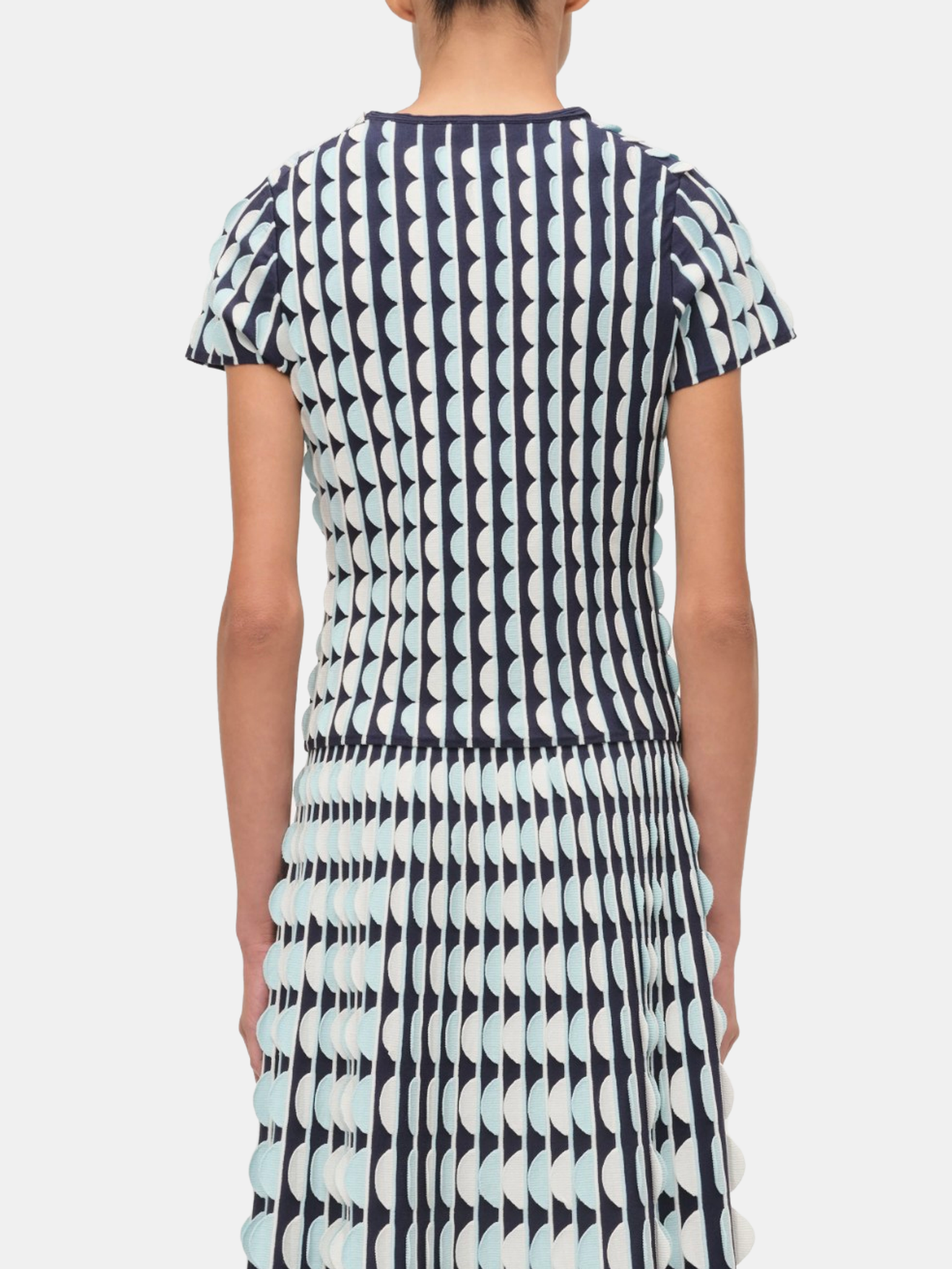 Crafted in a compact knit, this short-sleeve top features a sculpted fit and a rhythmic scallop pattern throughout. The streamlined profile offers structure while maintaining ease. A polished essential with a refined graphic edge. Pair with the Micah Scalloped Midi Skirt. Shown in Sky Multi.