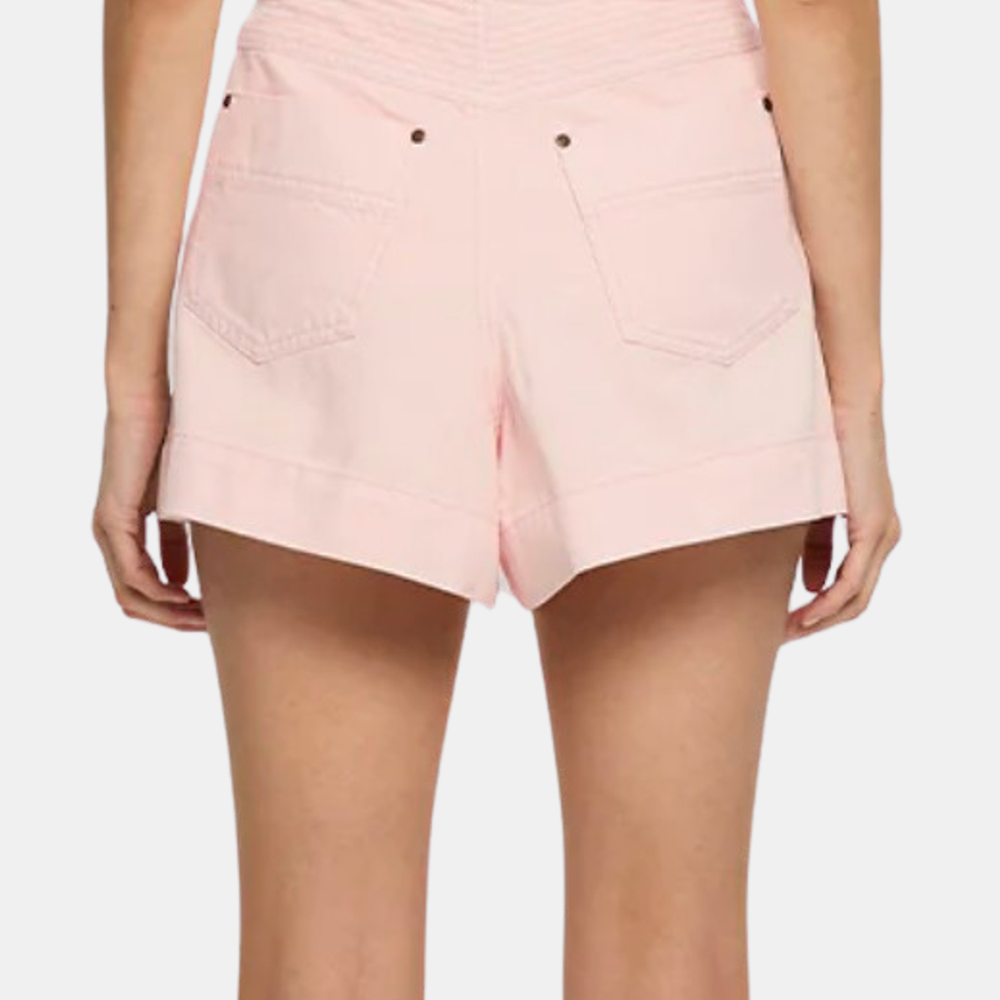 A modern essential, the signature Celene Short in pink features contrast topstitching and panel detailing, front fold over pockets, complete with antique brass logo hardware. Shown in Soft Pink.