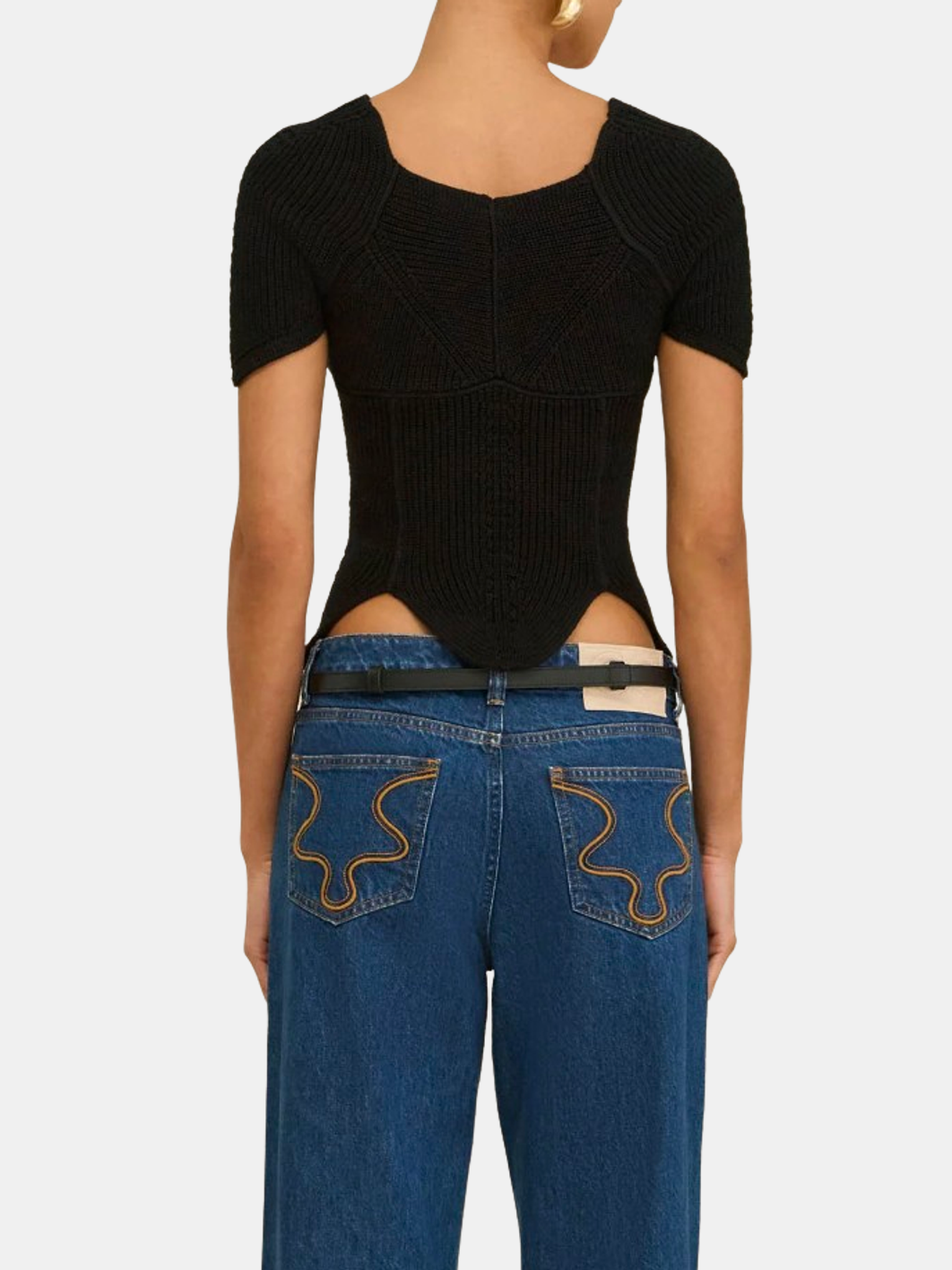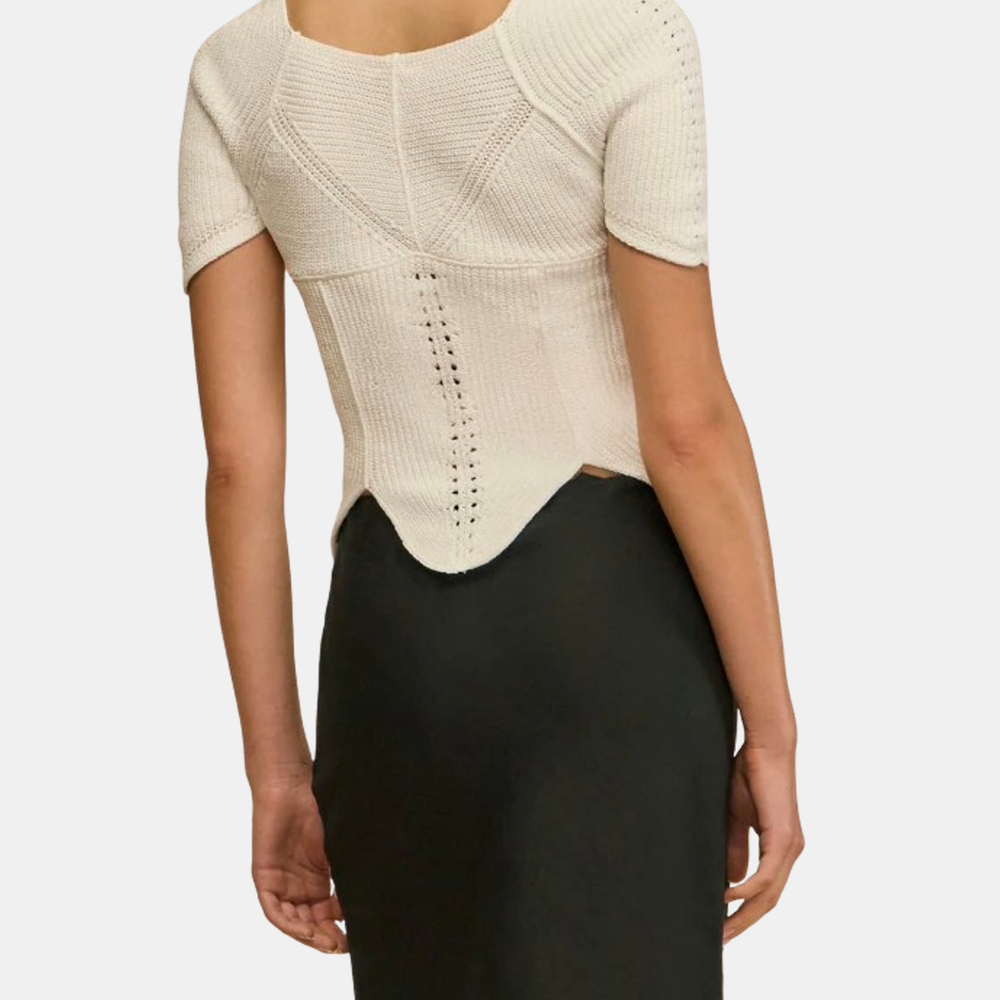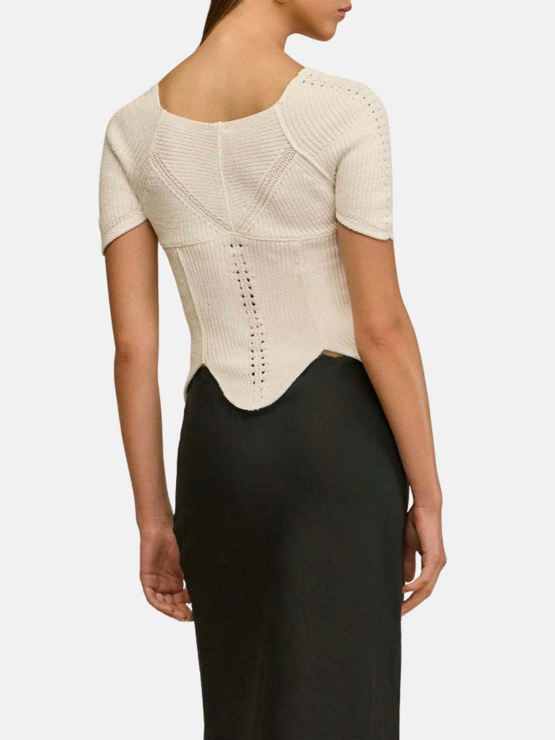 A hand-finished high-twist cotton knit top featuring engineered petal panels shaped to contour the body. Shown in Black and Off White.