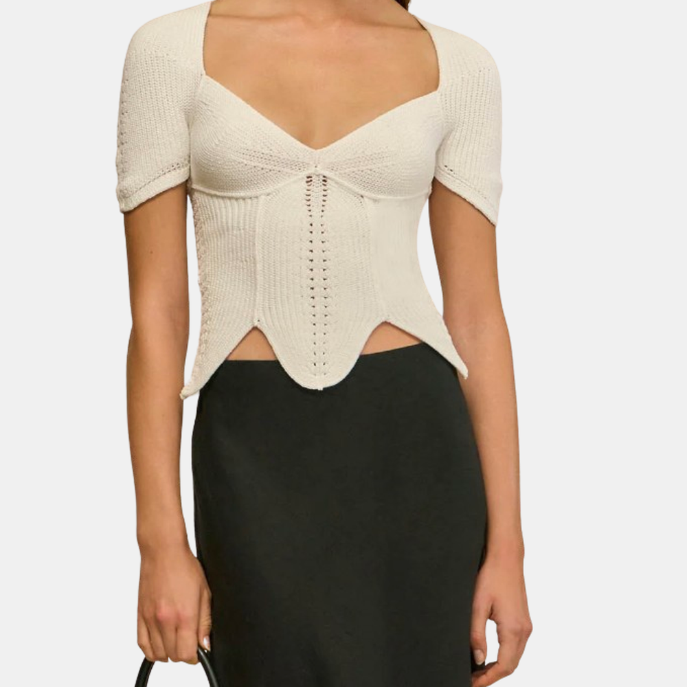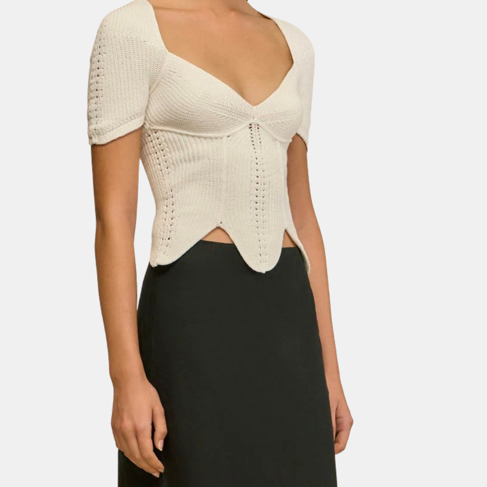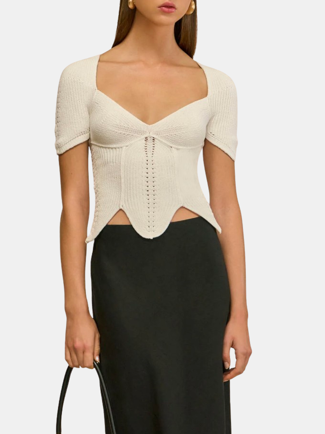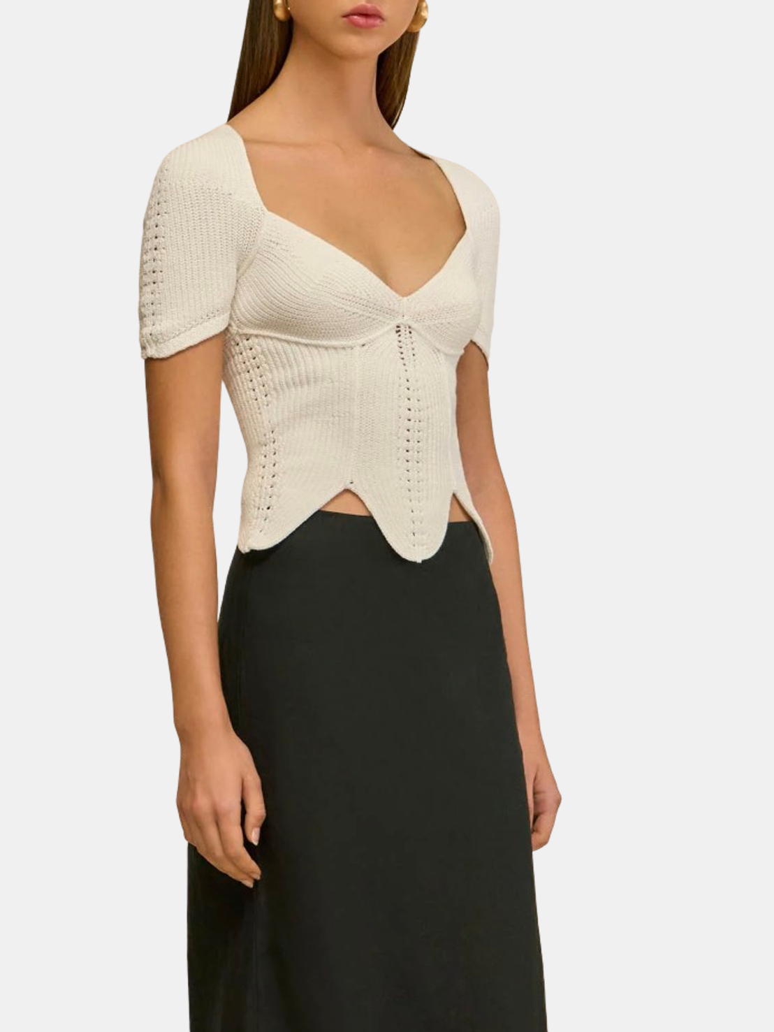 A hand-finished high-twist cotton knit top featuring engineered petal panels shaped to contour the body. Shown in Black and Off White.