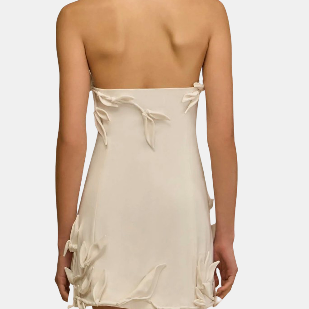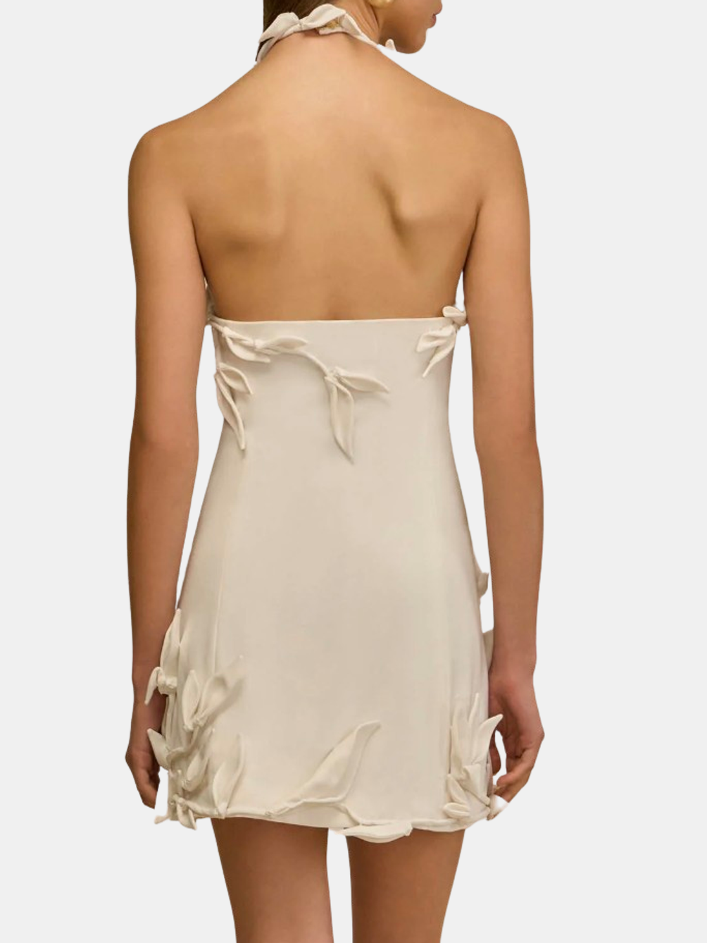 A double-crepe mini dress detailed with self-fabric calla lily appliqués that curve along the body and wrap into a halter neckline. With a tailored silhouette and 3D floral appliqués placed along side seams and hem. Shown in Off White.