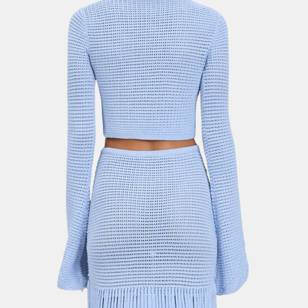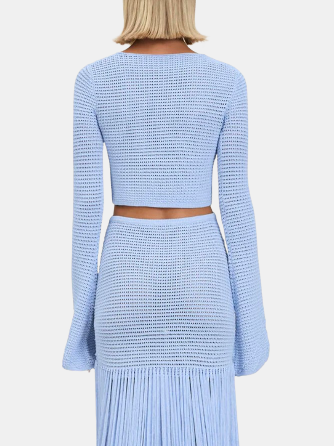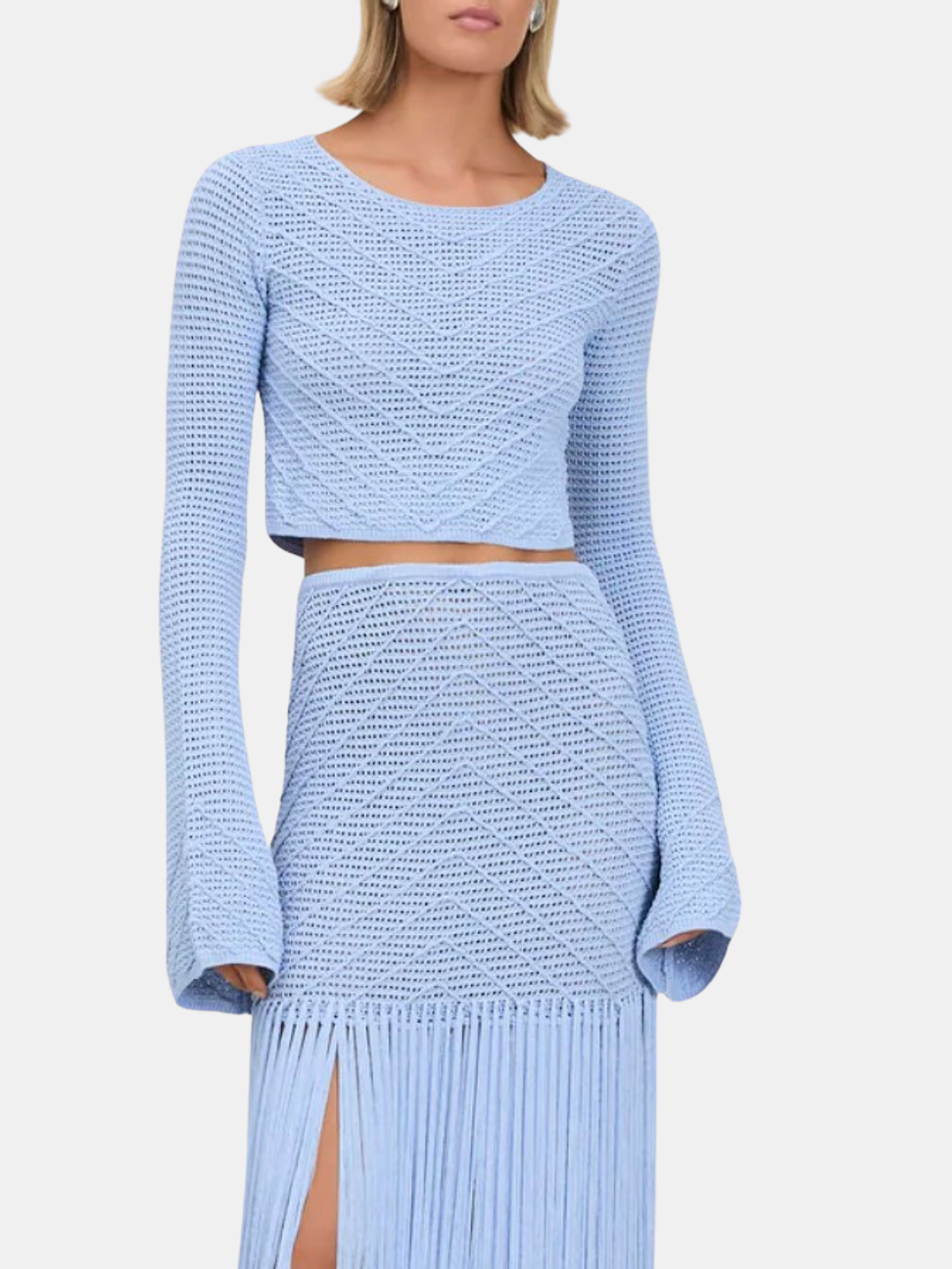 The Erin is a knitted, crop top with long bell sleeves that pairs back with the Enda Skirt. Shown in Mahogany and Skylar.