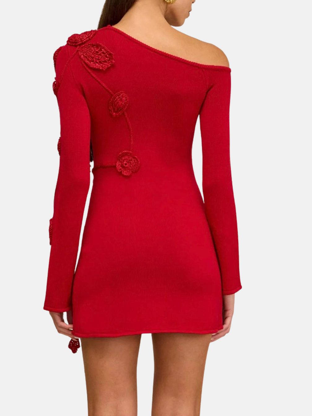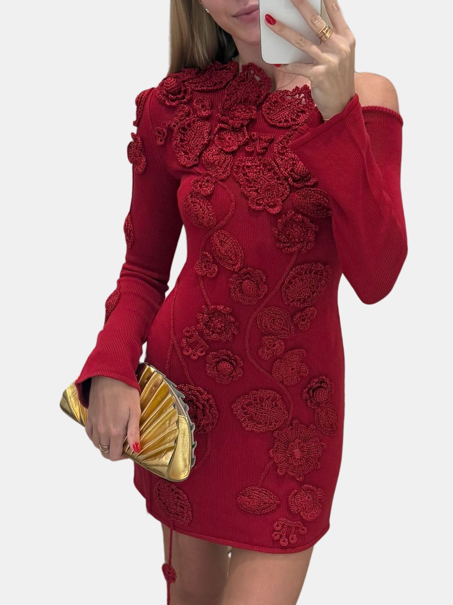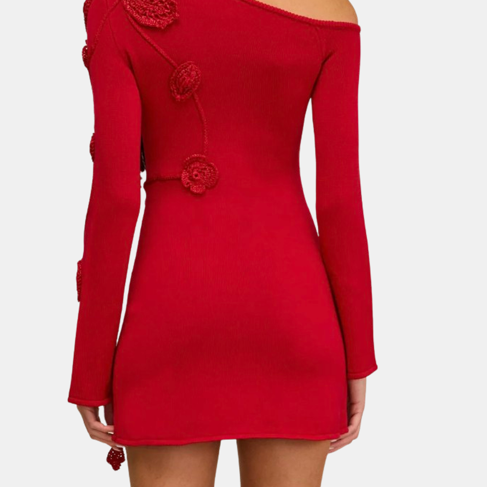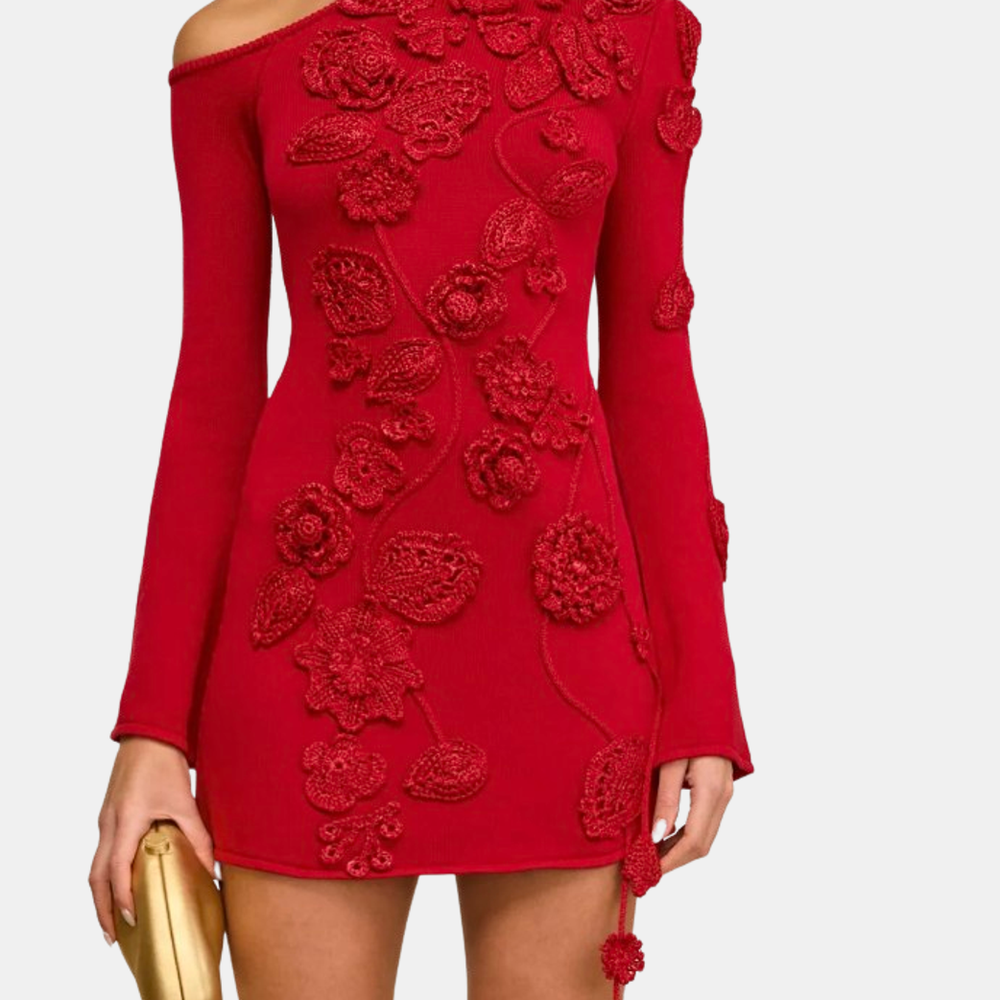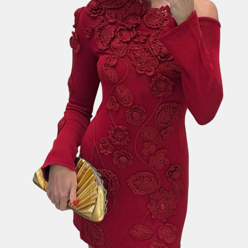 A hand-crocheted floral mini dress with an off-the-shoulder silhouette. The dress boasts remarkable 3D floral appliqué with its alluring off-the-shoulder design, long sleeves, and playful mini length, it's an unforgettable piece. Shown in Merlot.