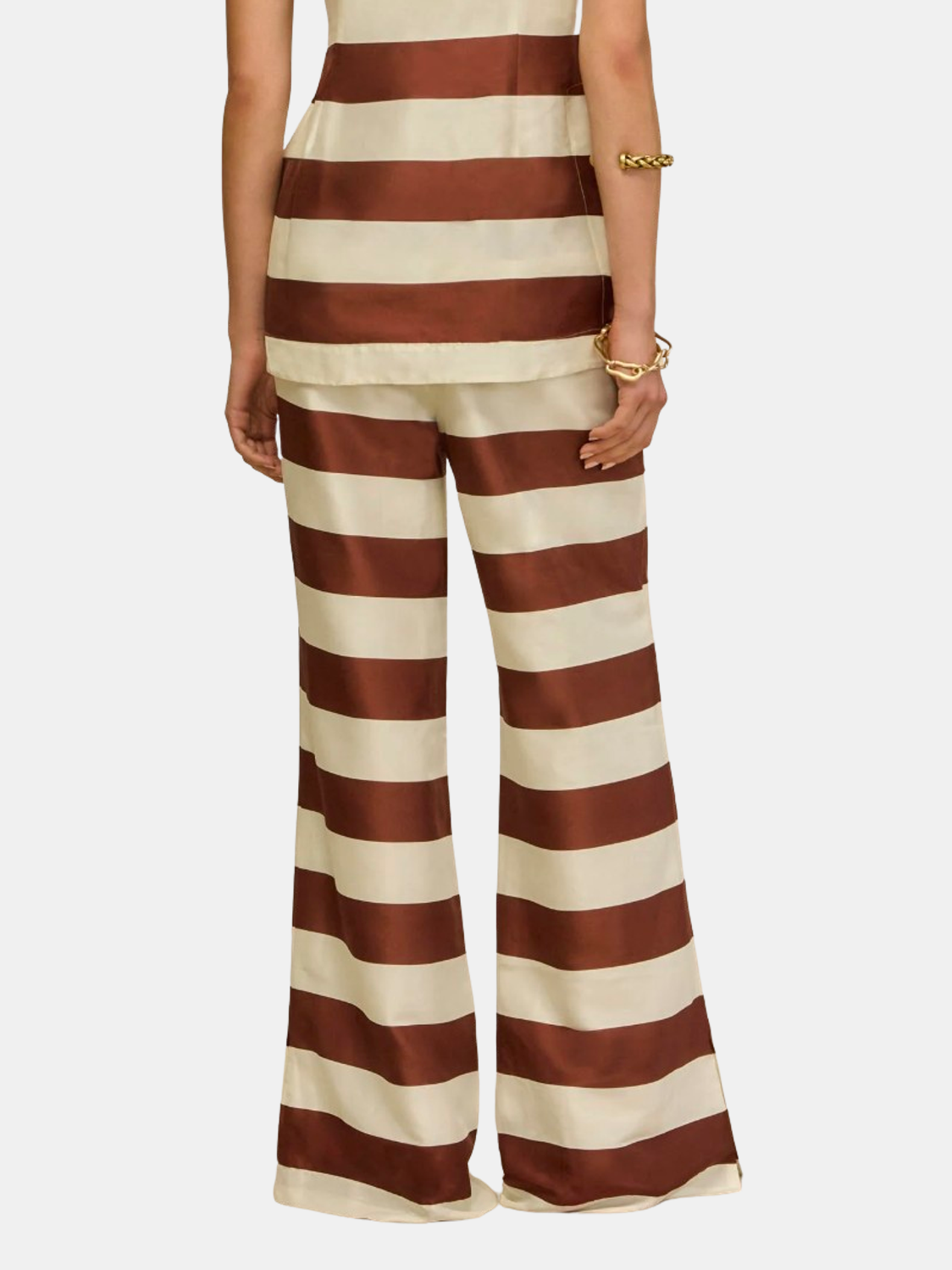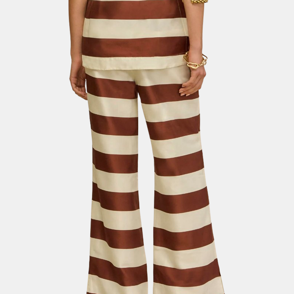 A wide-leg pant cut in lustrous silk with engineered horizontal stripes that create a graphic, statement-making silhouette. Shown in Stripe.