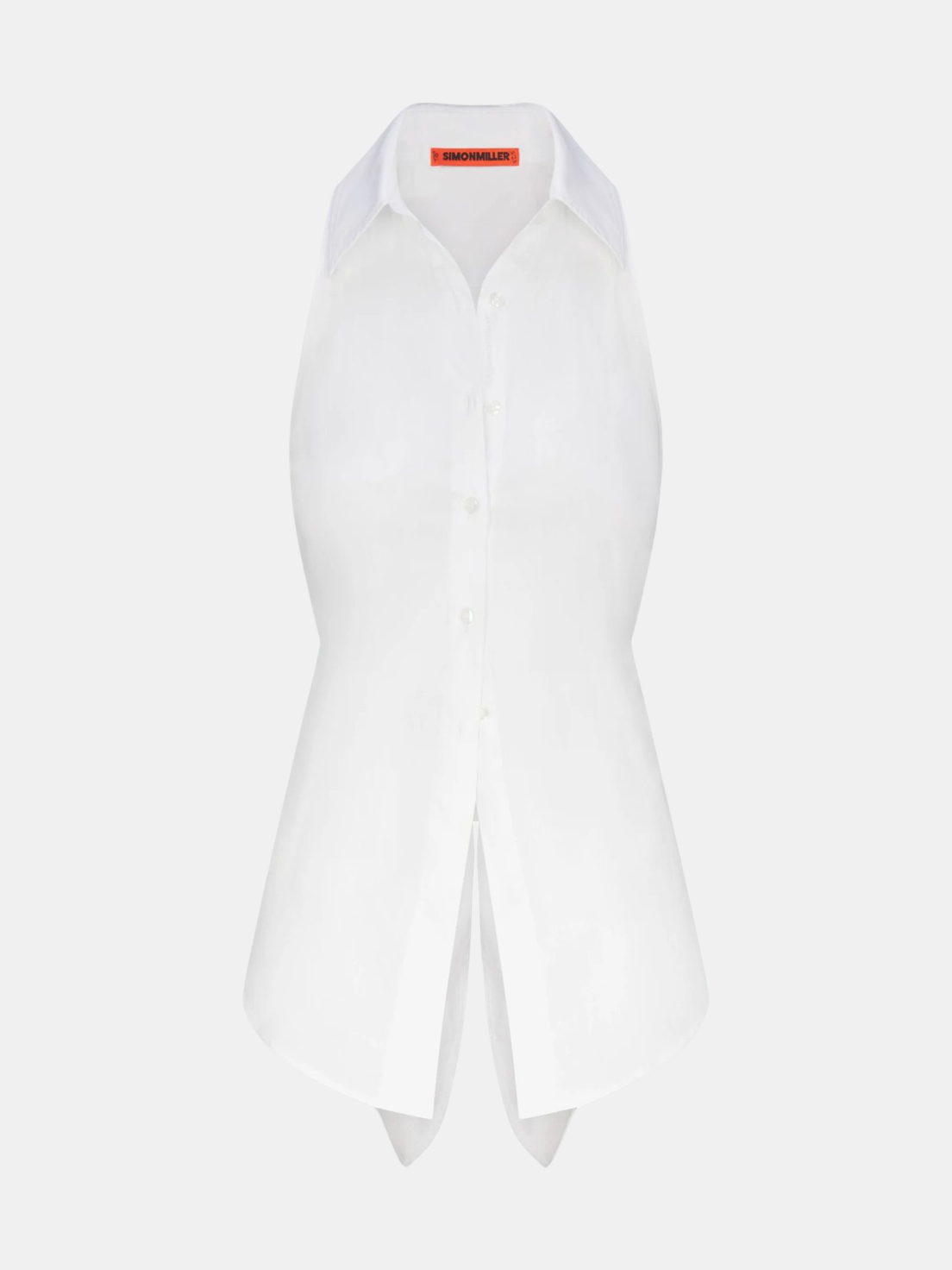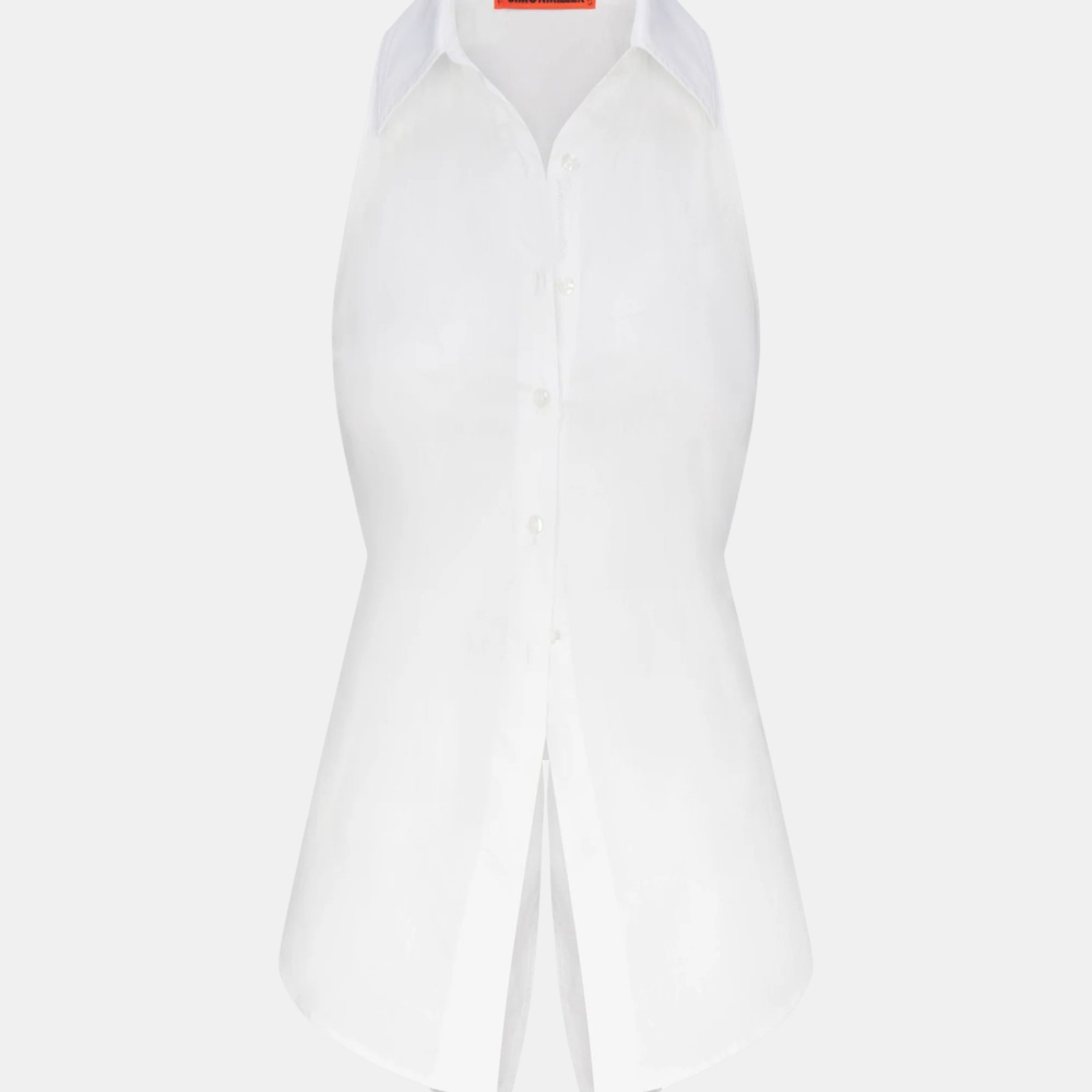 Loch now sleeveless. Stretch cotton poplin, with cut out back and adjustable tie for fit flexibility. The ultimate versatile piece, dress up or down. Shown in Macadamia.