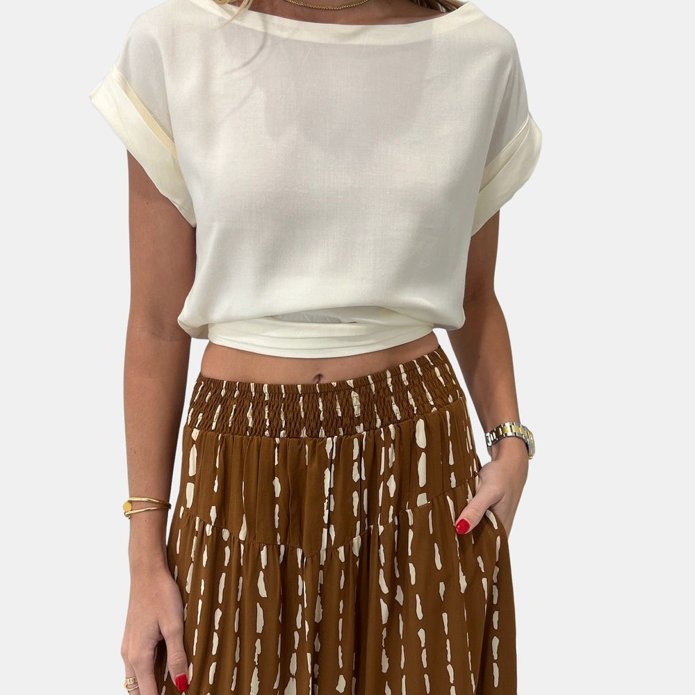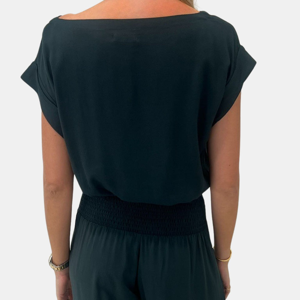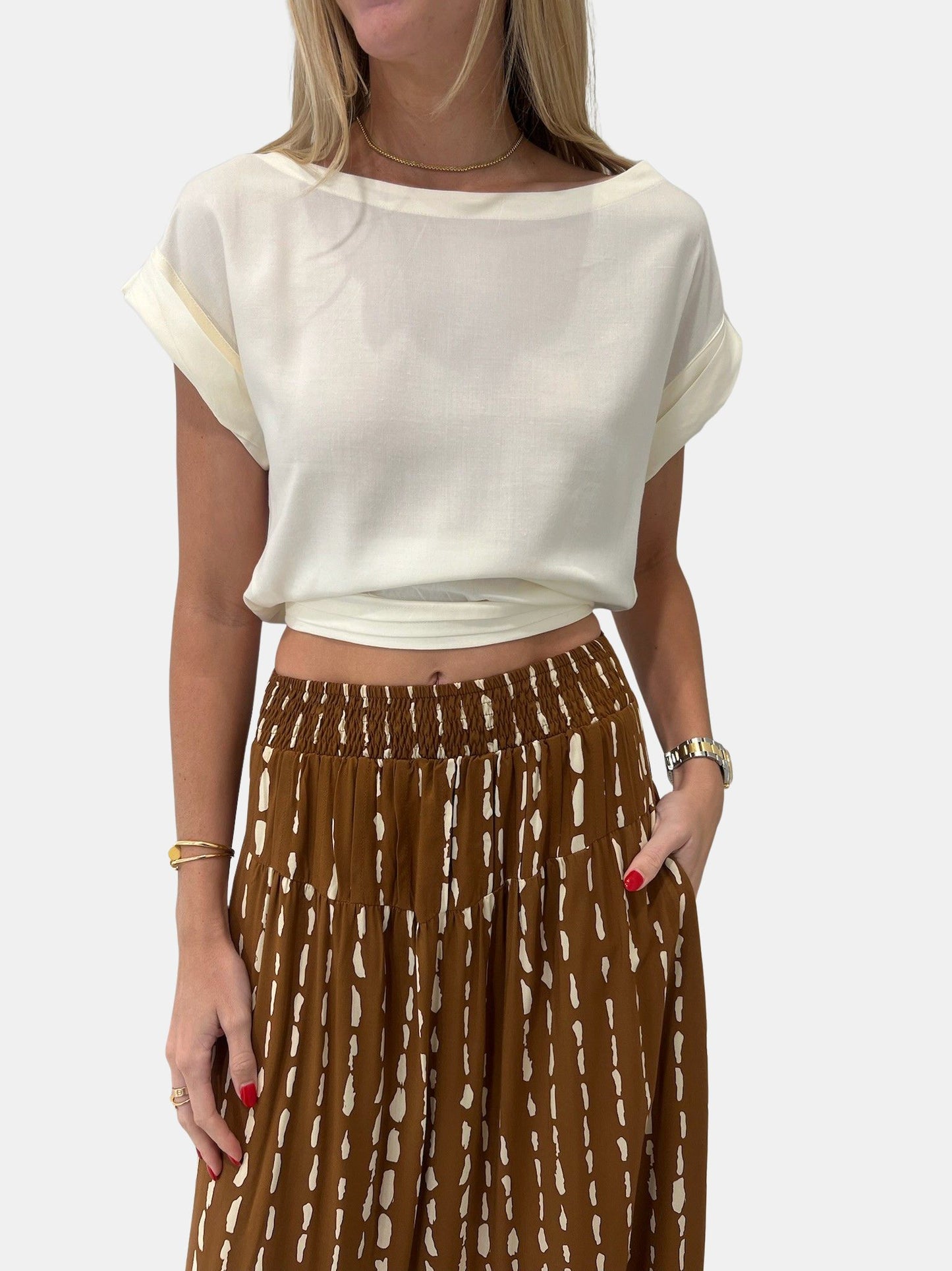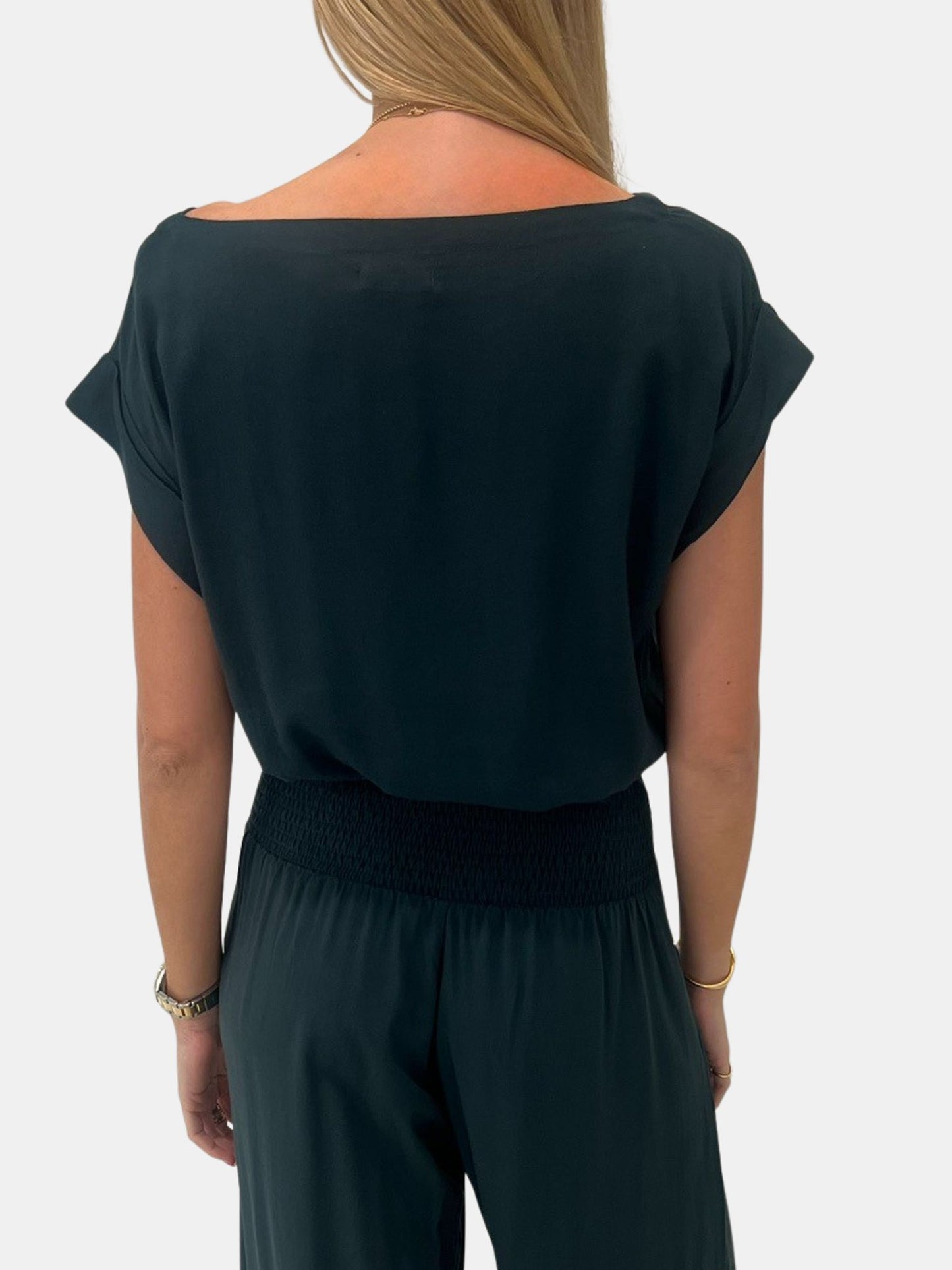 The Marvea Top is a chic boat neck top with flattering details. It features short cap sleeves, an elegant front pleated waist detail, and a comfortable elasticized back waist. Pair with the Johanna Pant or Zinia Shorts. Shown in Coco, Carbon, and Ivory.