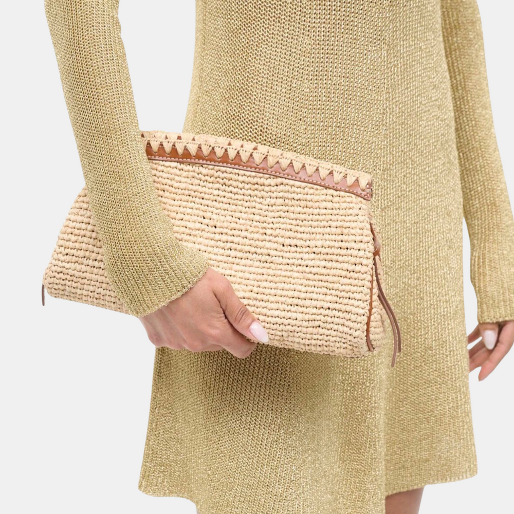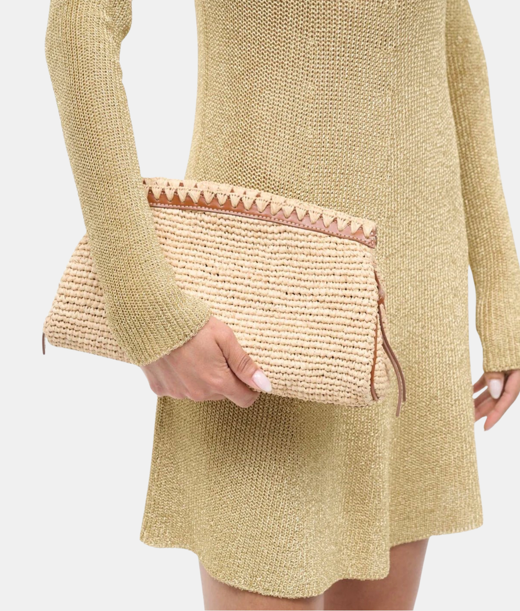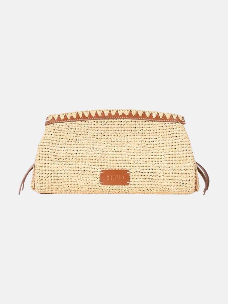 The Maude Convertible Clutch is a raffia hand-held clutch with our signature Maude knotted tie detail at the sides. It features an interior zip pocket, magnetic closure and removable leather shoulder strap. Shown in Natural Tan.