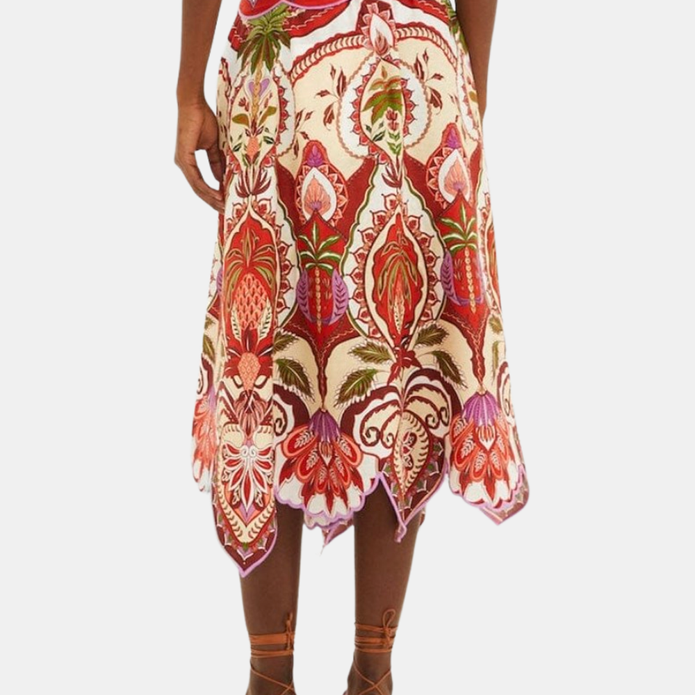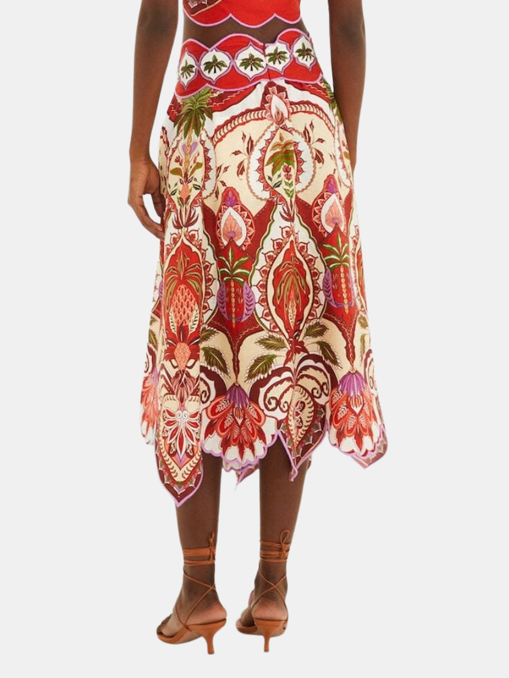 Step into effortless charm with the Red Odara Scallops Midi Skirt. Its vibrant red hue is beautifully complemented by playful scalloped edges, creating a lively silhouette that sways with every step. The midi length adds a touch of elegance, while the soft, breathable fabric invites warm, sunlit moments filled with joy and ease. Pair with the matching Odara Red One Shoulder Top. Shown in Odara.
