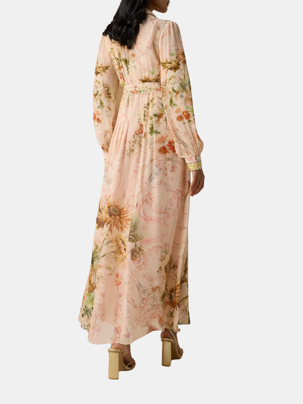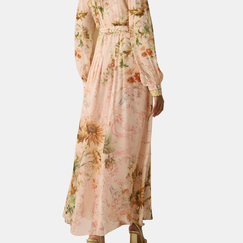 A graceful blend of ease and refinement. Crafted in a soft peach-hued viscose georgette with gold and silver lurex, it shimmers softly with every movement. Designed in a relaxed fit, it features a front placket with a shirt collar, blouson sleeves with cuffs, and a matching slip for comfort. A floral chintz print enhances its festive charm, while the buckle belt adds definition to the flowing silhouette. Shown in Coral.